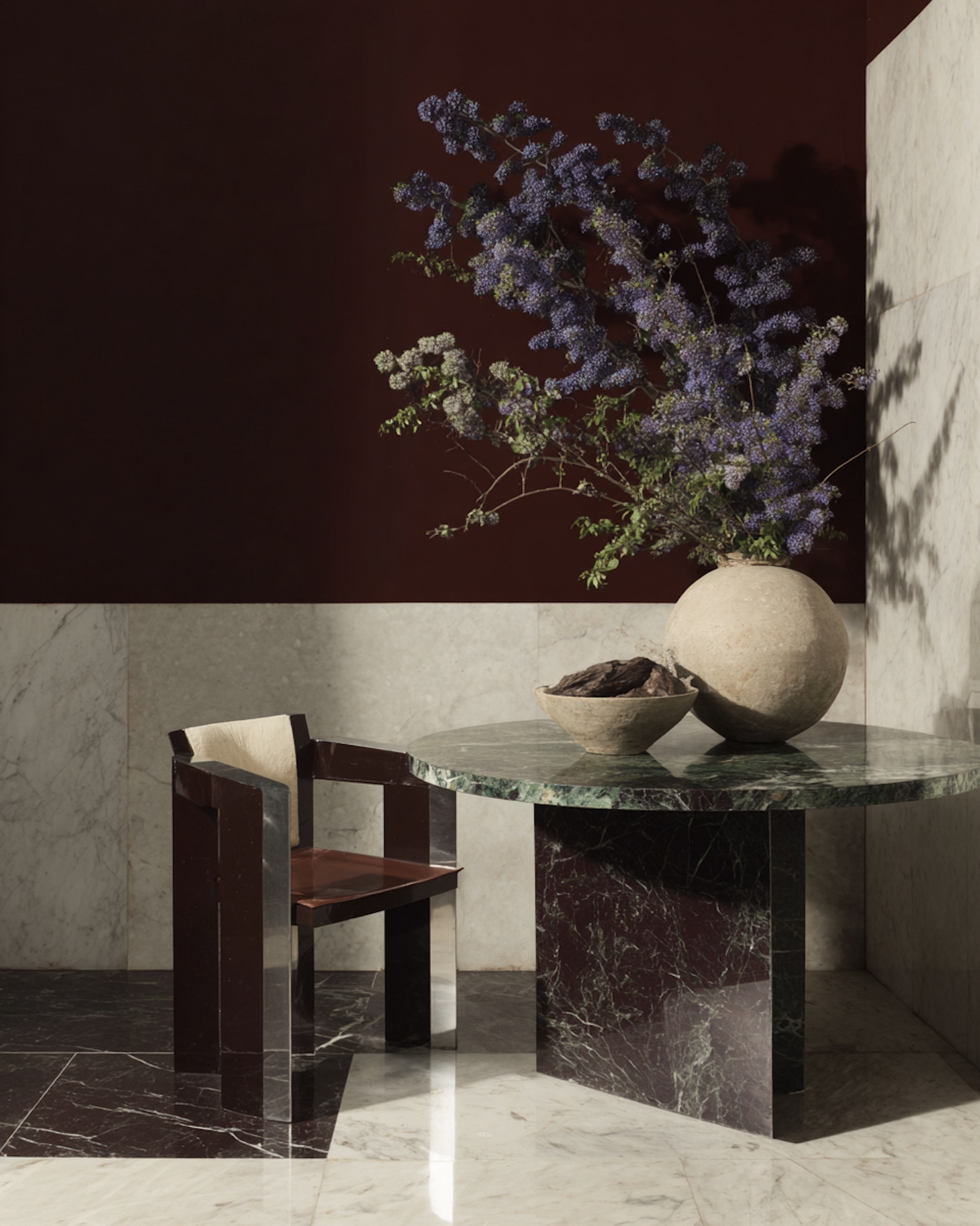 Elegant interior with a marble table, a modern chair, and a floral arrangement against a burgundy and marble backdrop.