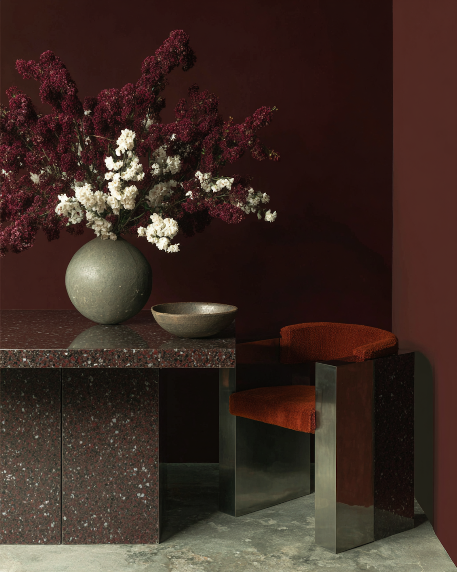 Modern interior with a stone table, burgundy and white flowers in a vase, and a rust-colored chair against a deep red wall.