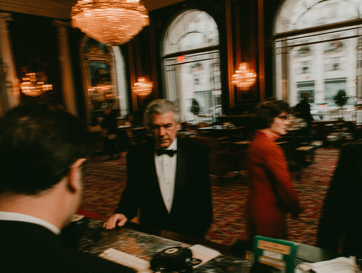 A man in a tuxedo stands at a counter in a luxurious interior with chandeliers and arched windows, exuding elegance and sophistication.