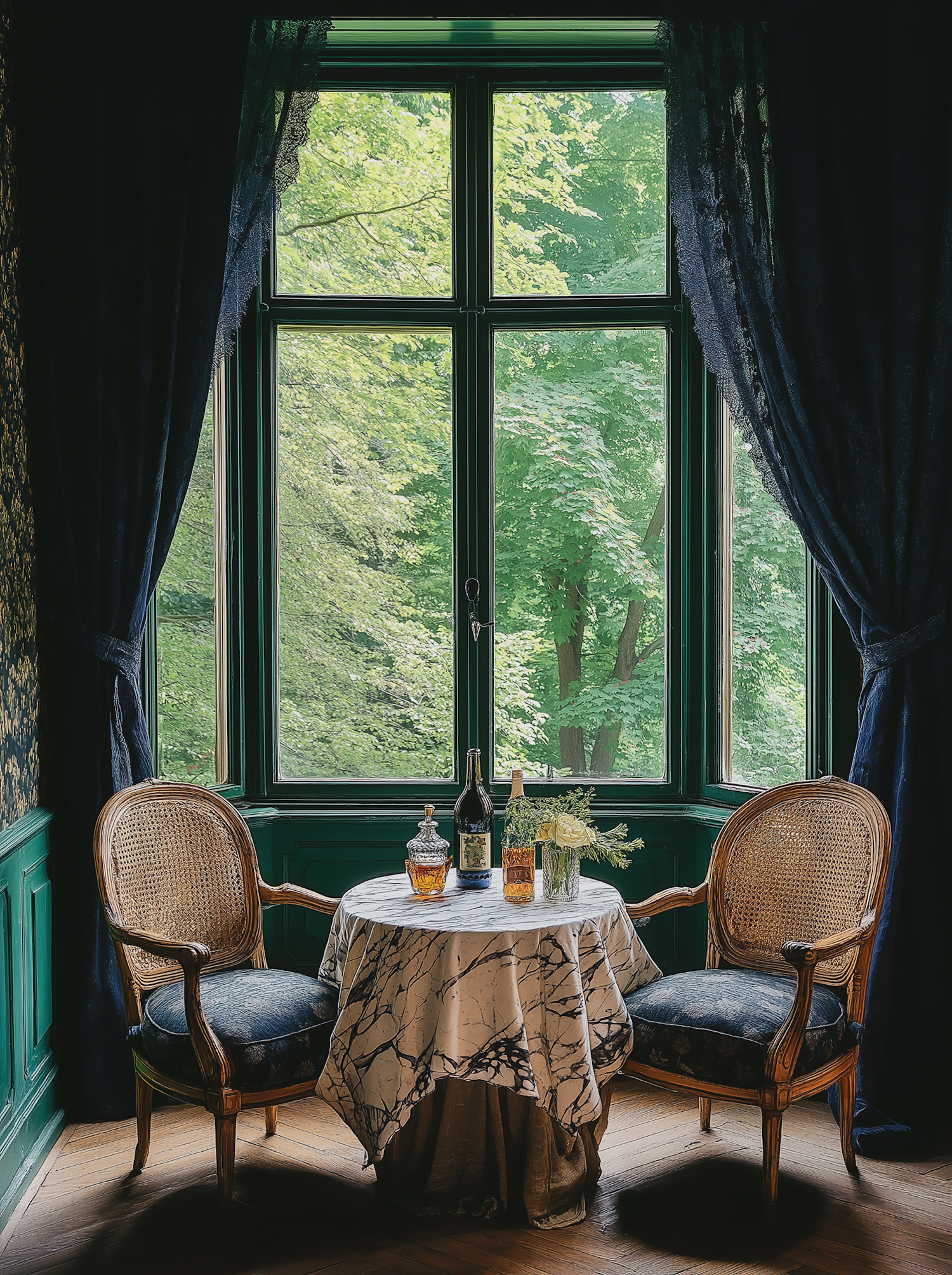 Elegant interior with vintage chairs, a marble table, and a lush green view through a large window. Perfect for a cozy, sophisticated setting.
