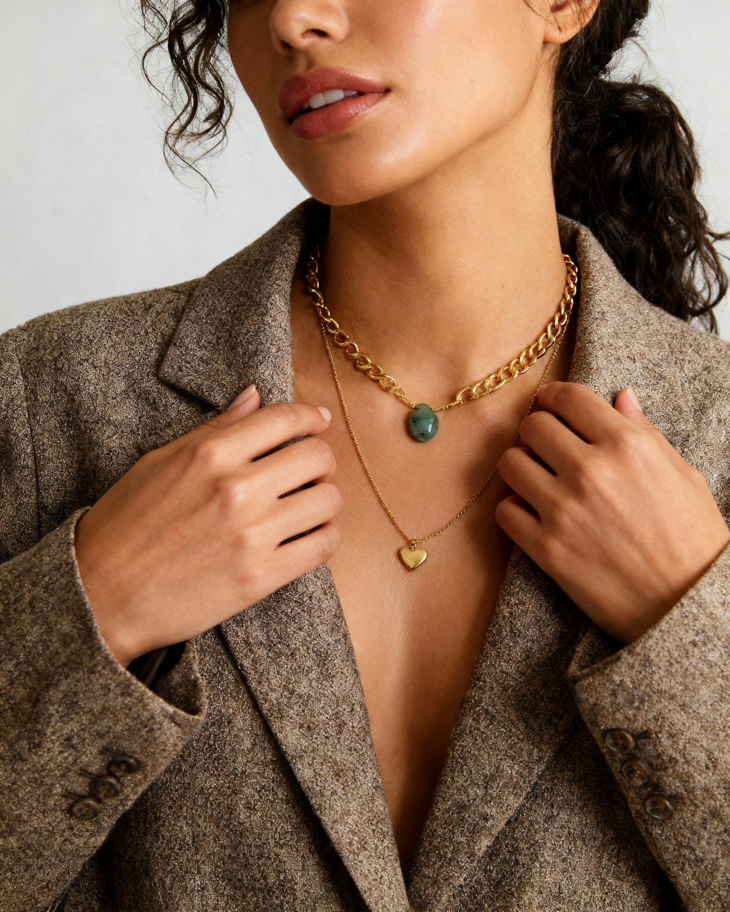 Close-up of a person wearing a brown blazer and gold necklaces with green stone and heart pendants, highlighting elegant jewelry.