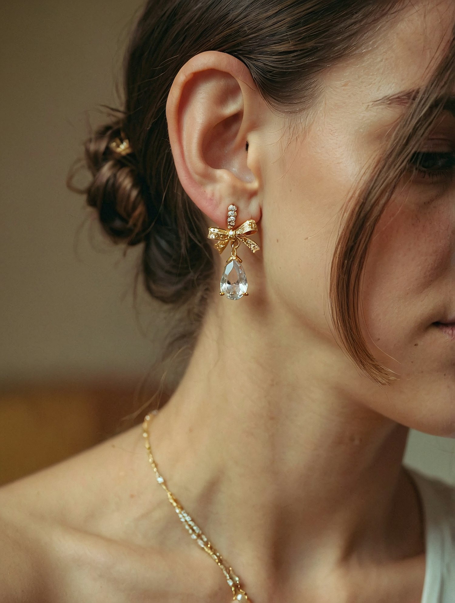 Close-up of a gold bow earring with a teardrop crystal, paired with a delicate gold necklace. Perfect for elegant and sophisticated looks.