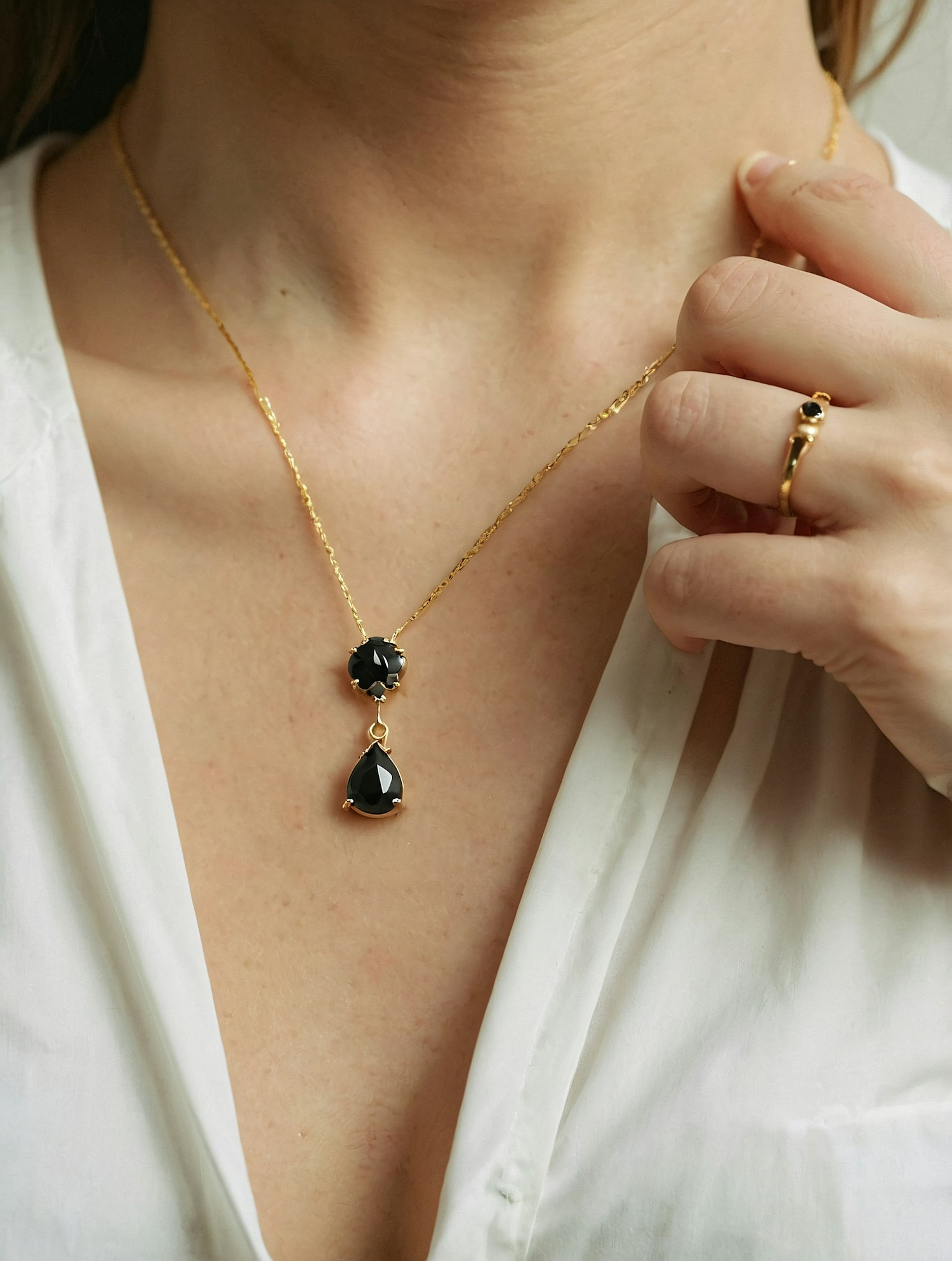 Elegant gold necklace with black gemstones paired with a matching ring, styled with a white blouse for a minimalistic and chic look.