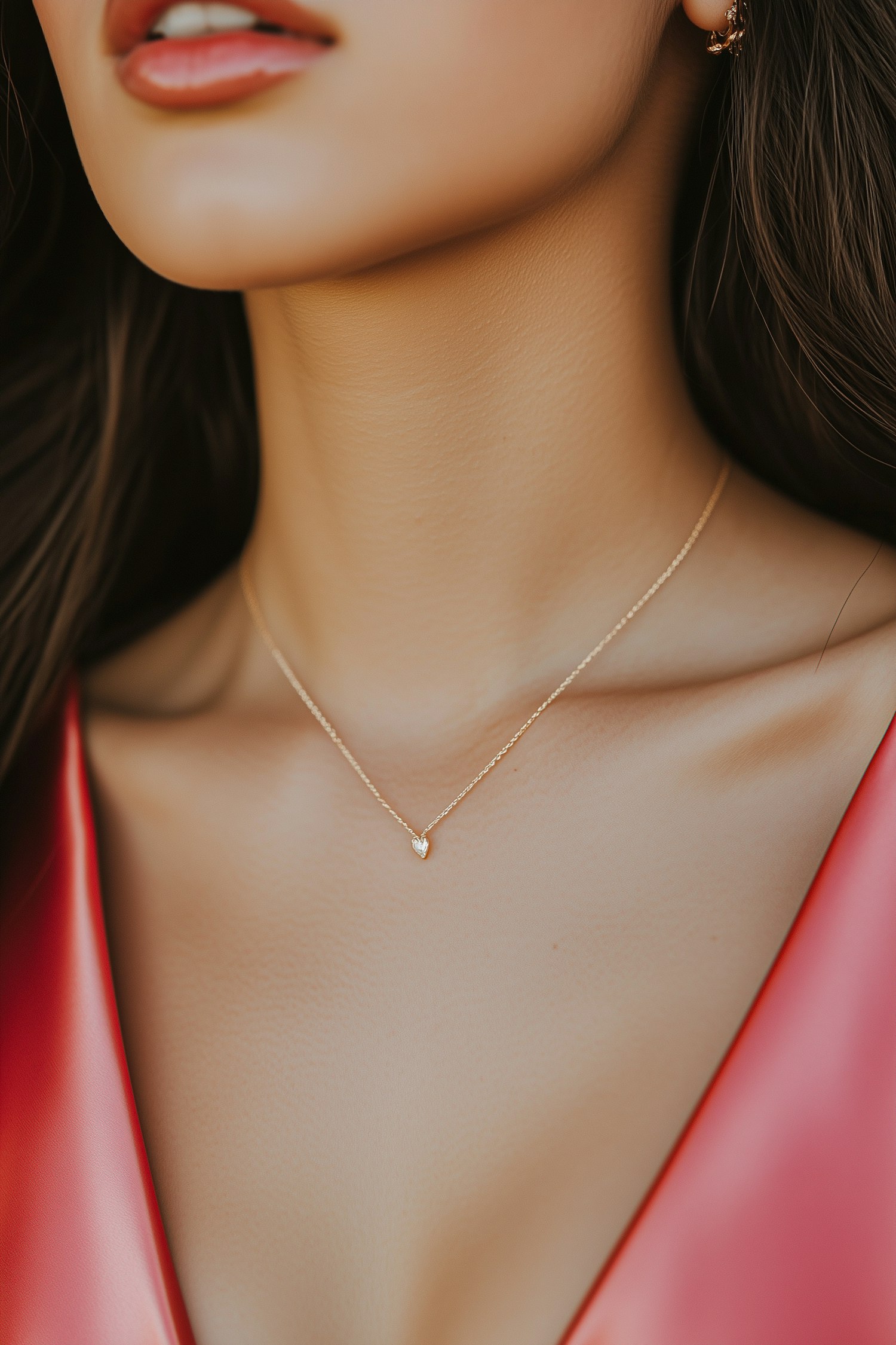 Close-up of a woman's neck with a gold necklace and red satin dress, highlighting elegance and style.
