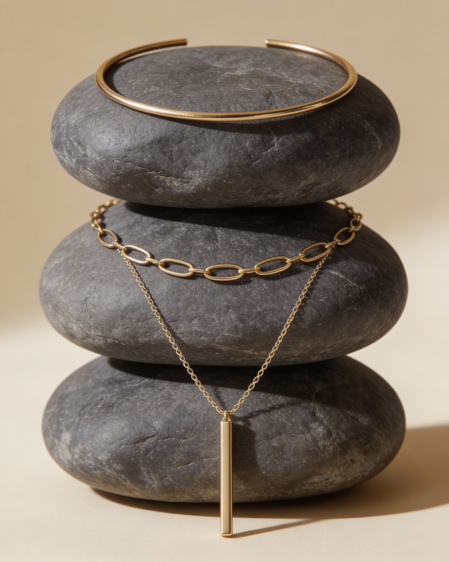 Elegant gold jewelry displayed on smooth gray stones, featuring a bangle, chain bracelet, and bar pendant necklace in a minimalist setup.