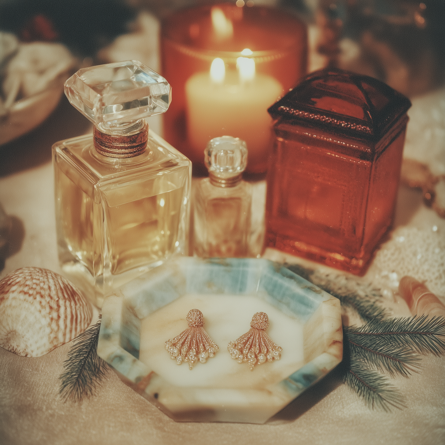 Elegant earrings on a marble dish, surrounded by perfume bottles, candles, and festive decor, creating a warm and luxurious ambiance.