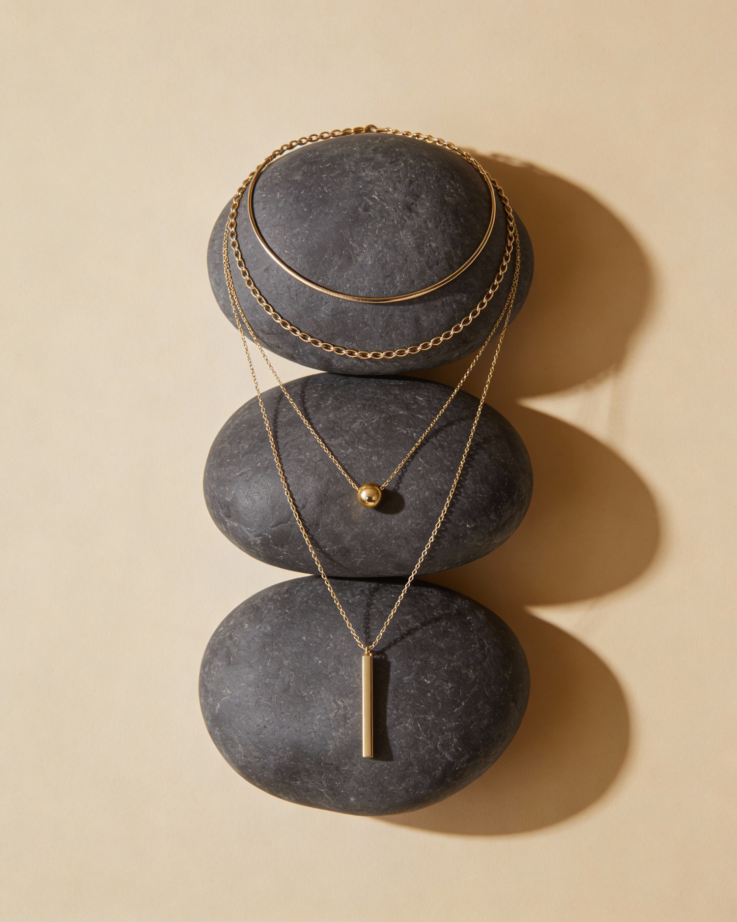 Elegant gold necklaces with unique pendants draped over smooth gray stones, creating a minimalist and balanced aesthetic.
