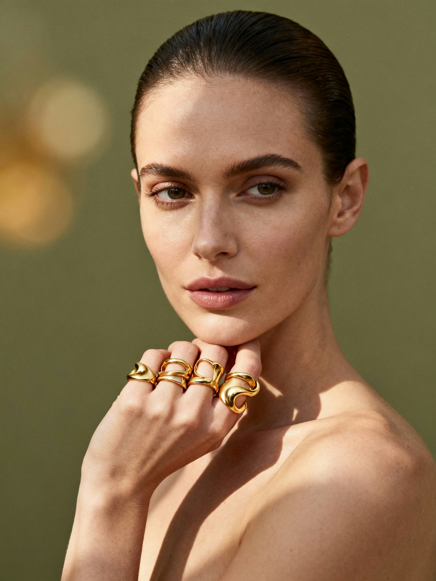 editorial jewelry photography, fine jewelry, minimalistic composition, soft natural light, high-end luxury aesthetic, shallow depth of field, neutral clean backdrop, warm and muted tones, cinematic shadows, ultra-realistic details — half-body portrait of a woman with hand resting on her chin wearing multiple sculptural gold rings, slicked hair, soft glowing skin, muted olive background, directional warm light sculpting the jewelry