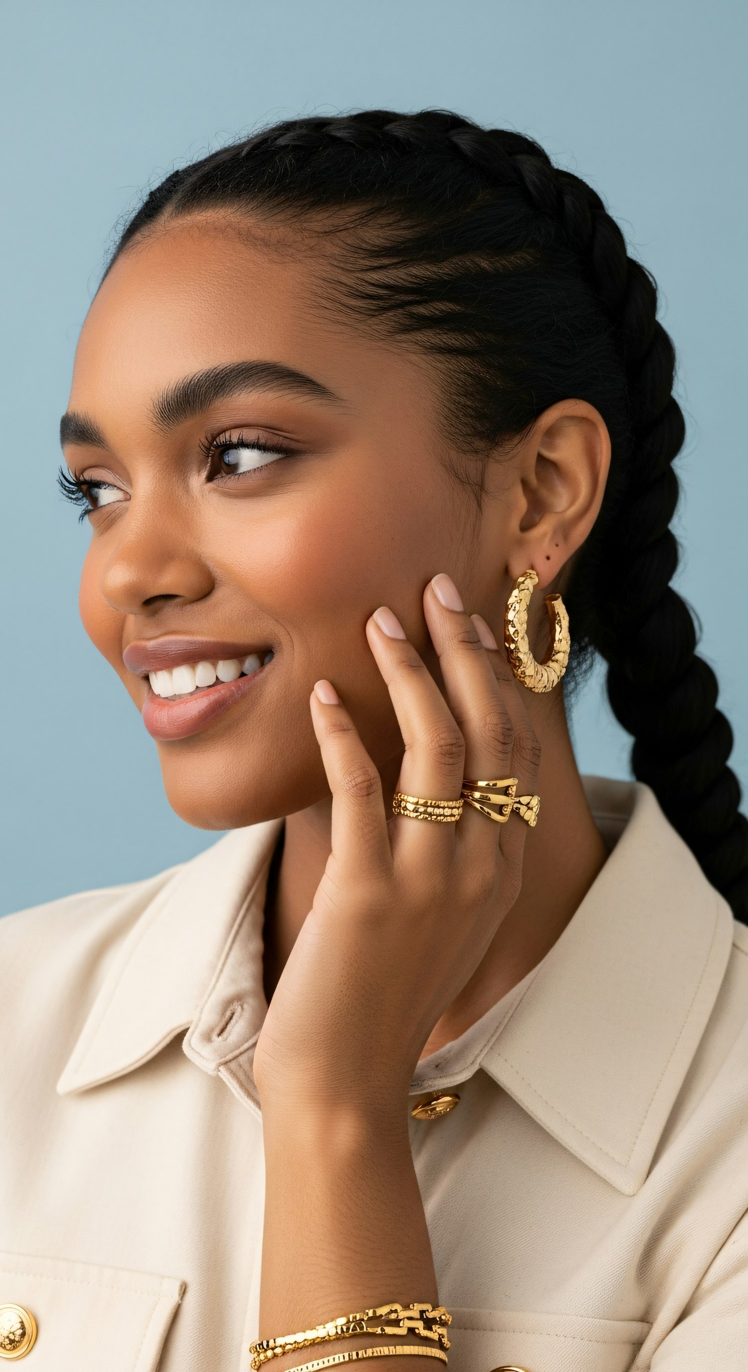 Smiling person showcasing gold hoop earrings, rings, and bracelets, styled with a cream top against a pale blue background.