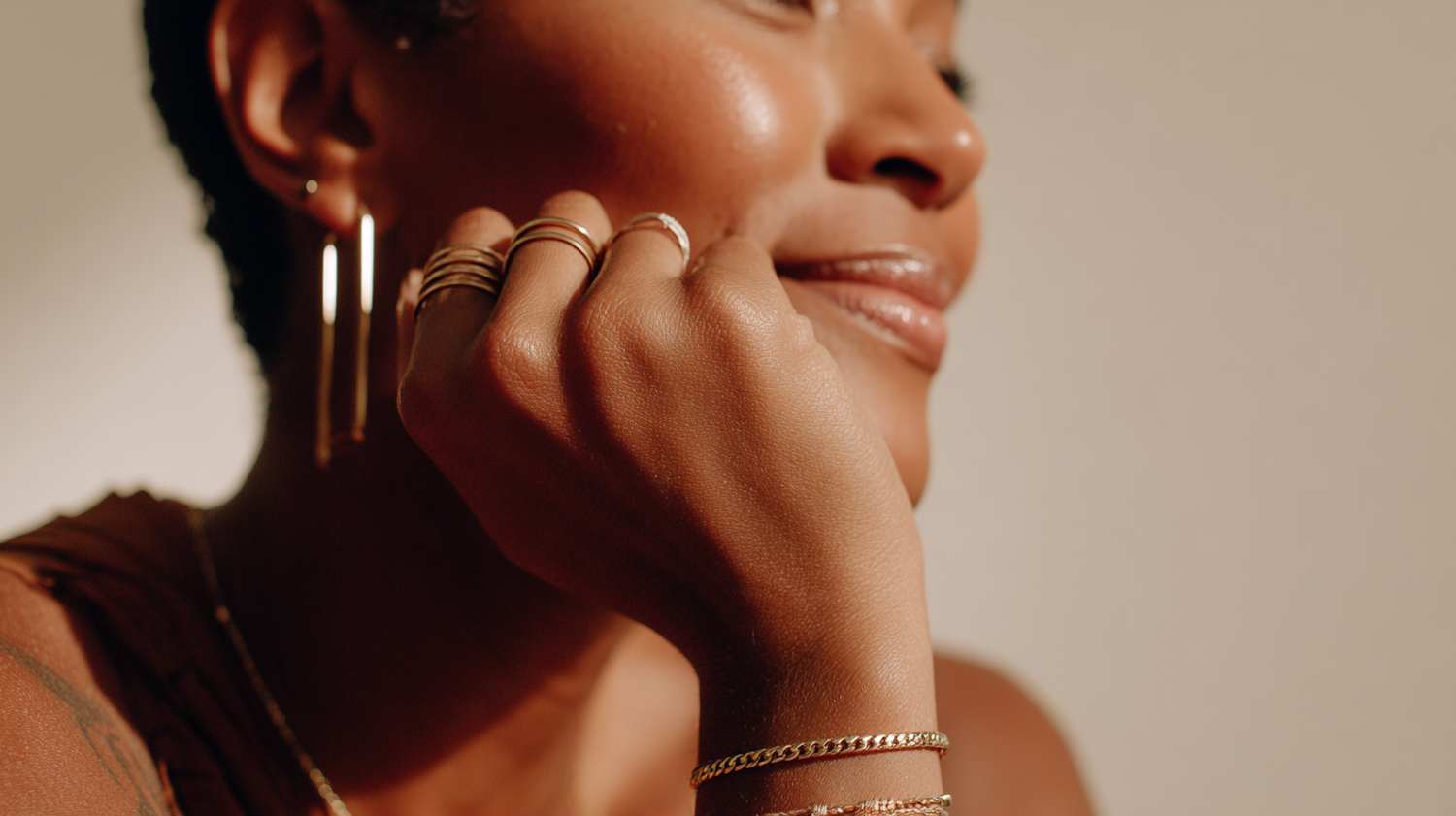 Close-up of a person wearing gold jewelry, including rings, bracelets, and hoop earrings, with warm lighting highlighting their features.