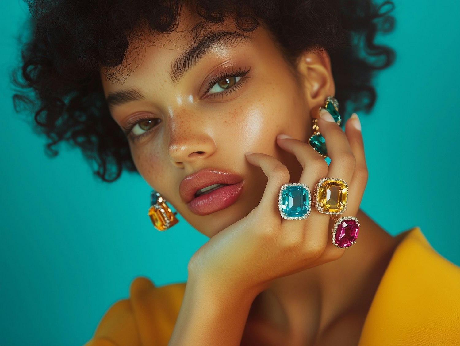 A woman with vibrant gemstone jewelry poses against a turquoise background, showcasing colorful rings and earrings.