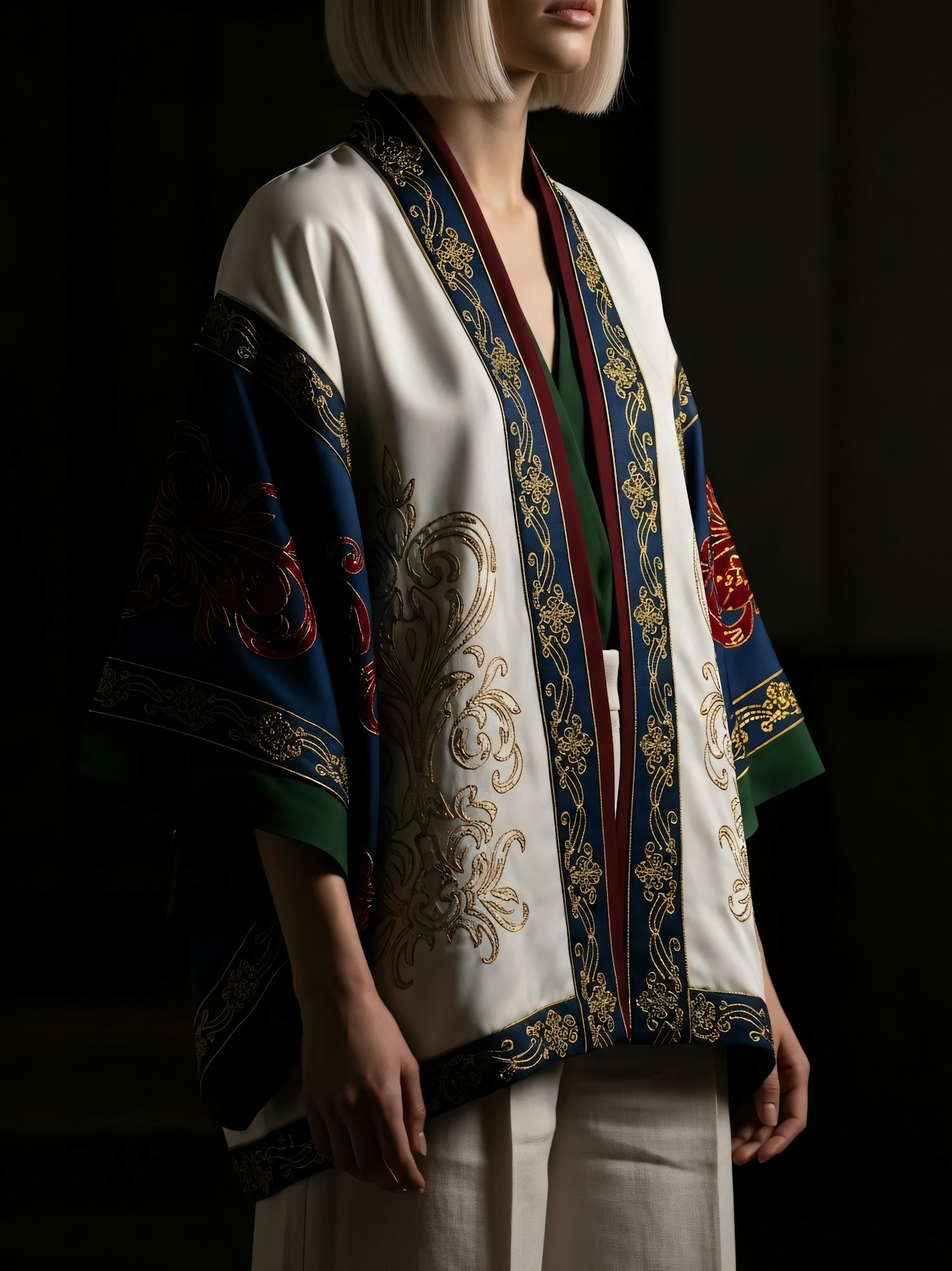 A stylish individual wearing a detailed kimono-style robe with gold embroidery and vibrant accents, standing in a dimly lit setting.