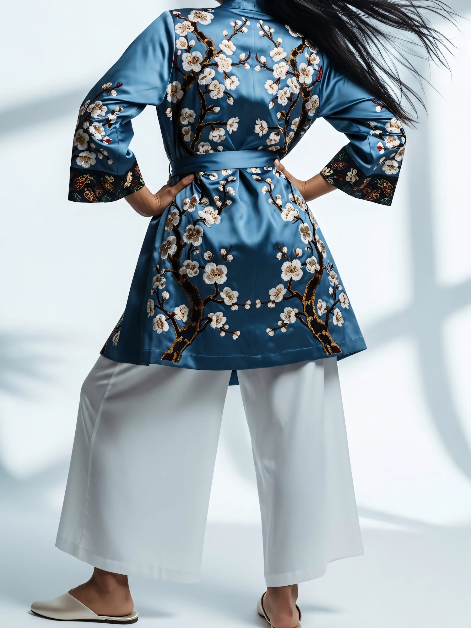 A stylish blue floral kimono paired with white pants, showcasing intricate embroidery and modern elegance in a softly lit setting.