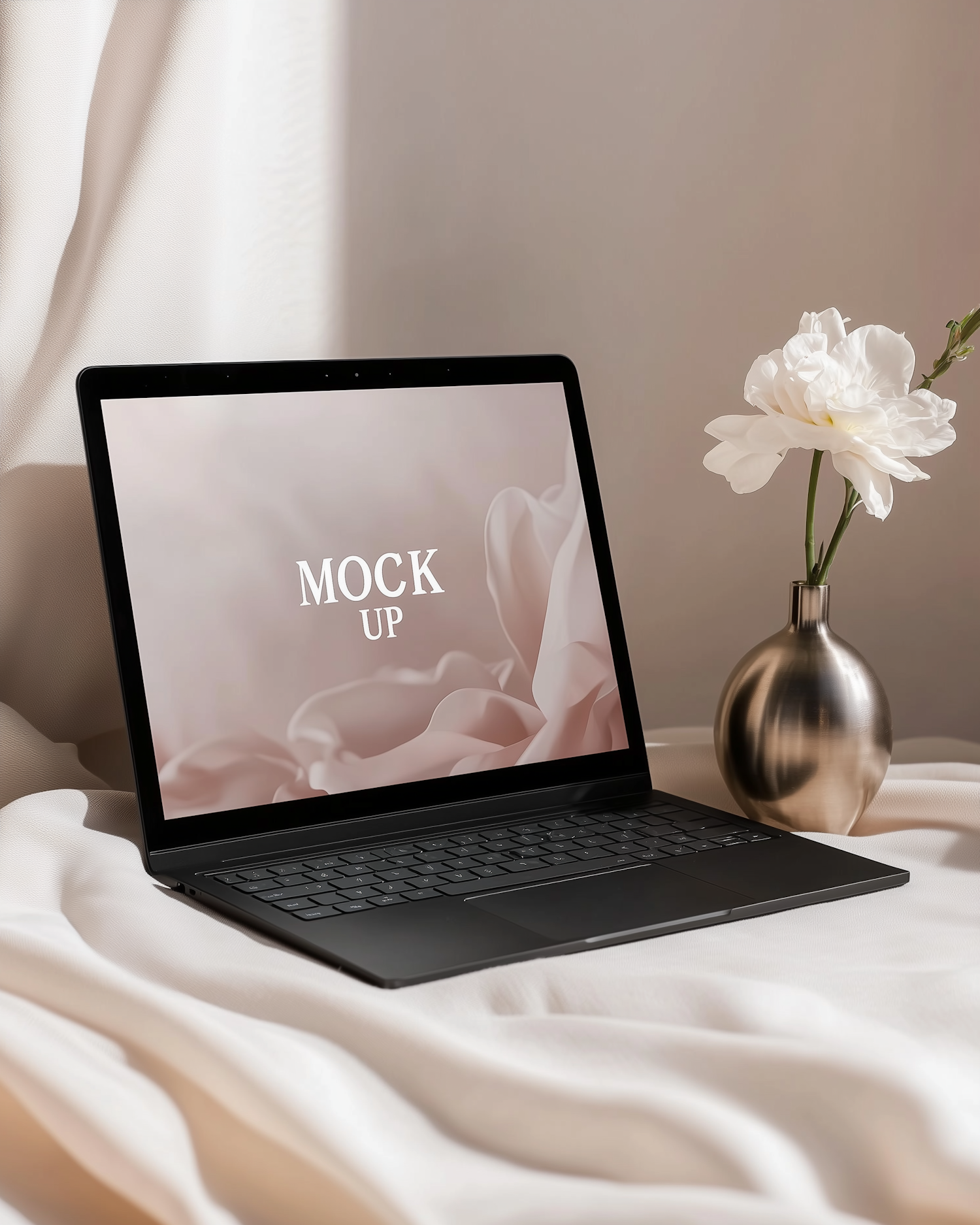 Minimalist laptop mockup on soft fabric with a metallic vase and white flower, bathed in warm natural light for a cozy aesthetic.