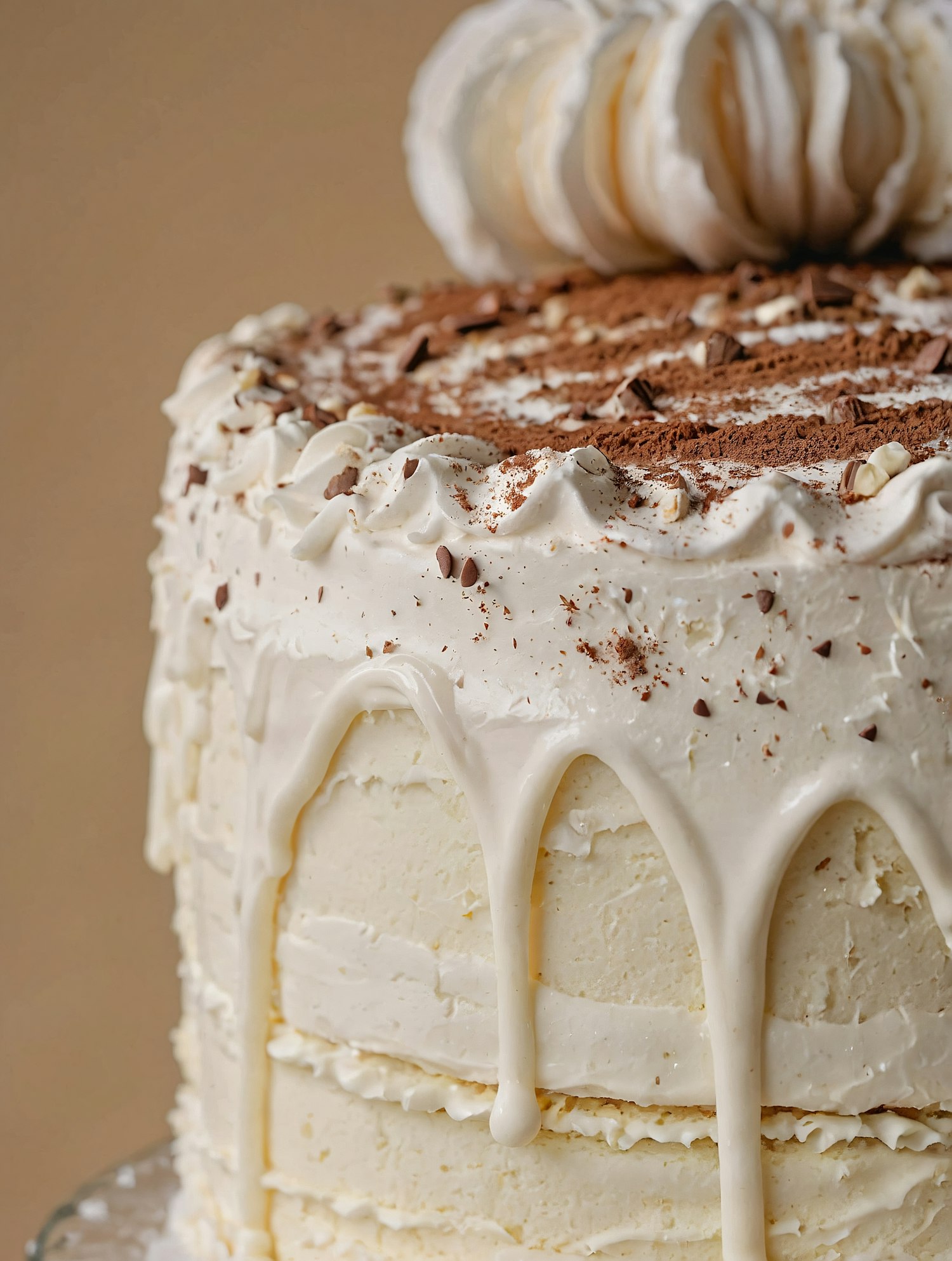Close-up of a layered cake with white frosting, cocoa dusting, chocolate shavings, and a meringue topper. Perfect for celebrations!