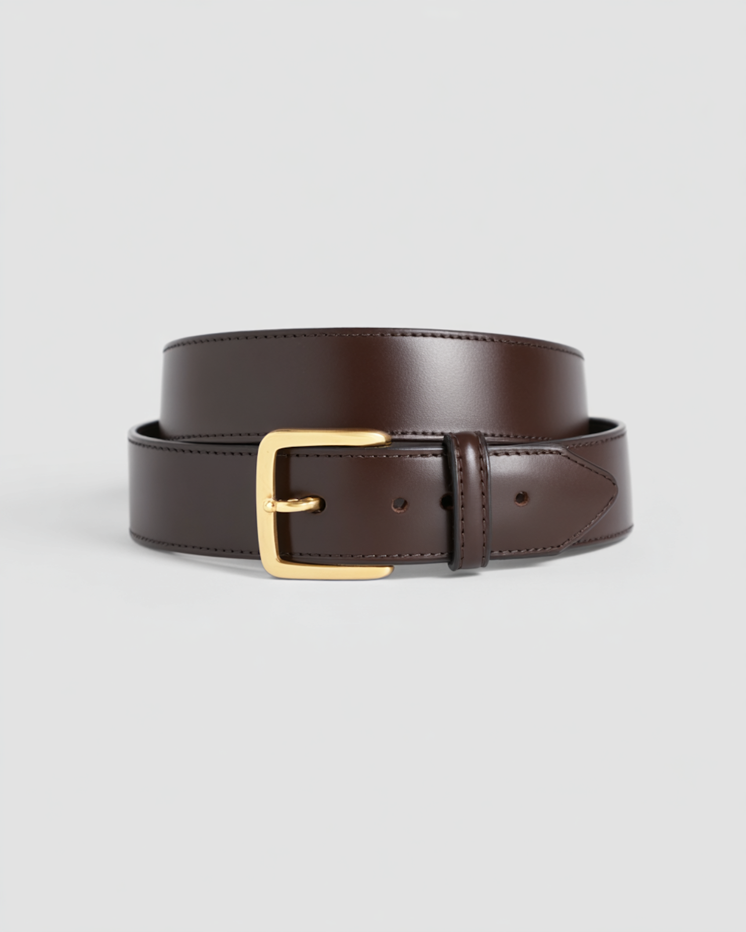 A stylish brown leather belt with a polished gold buckle, perfect for adding a touch of elegance to any outfit.