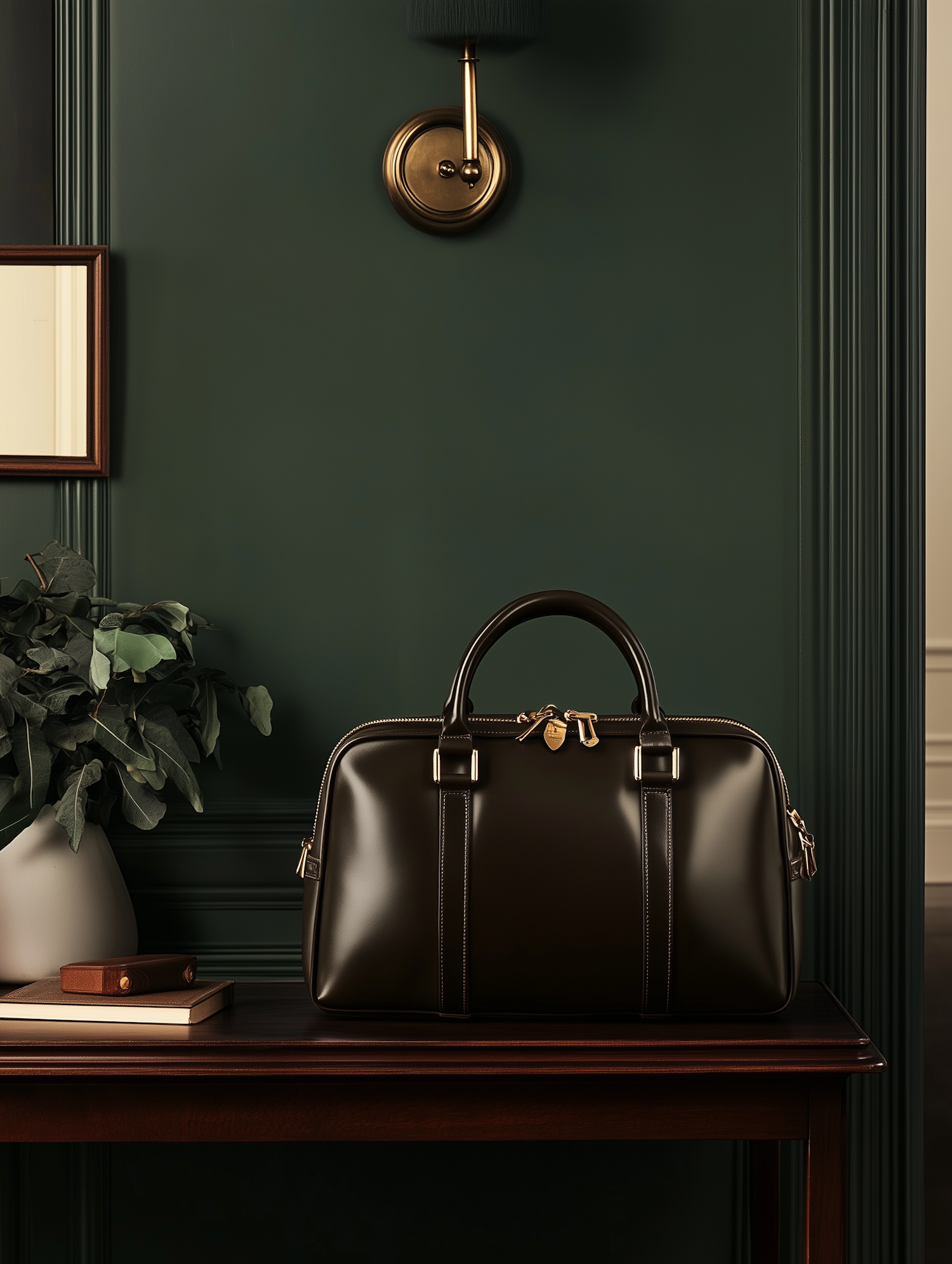 Elegant dark leather duffle bag with gold hardware on a wooden table, set against a deep green wall with classic decor accents.