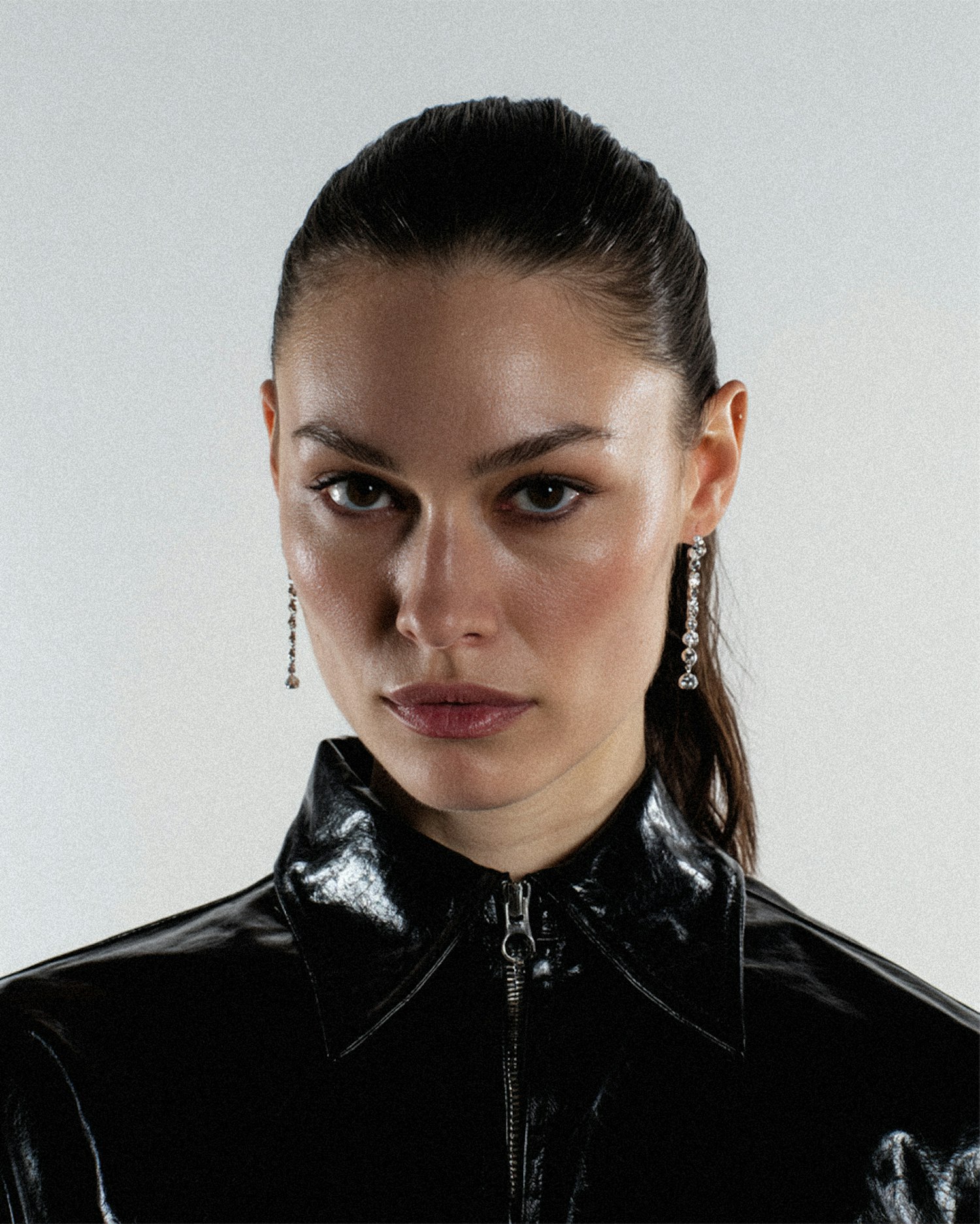 A woman in a black leather jacket with sleek hair and elegant earrings, captured against a neutral background.