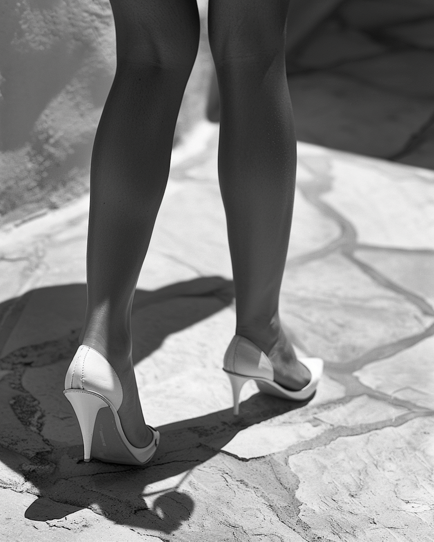 Monochrome image of legs in white high heels walking on a stone path, casting strong shadows.