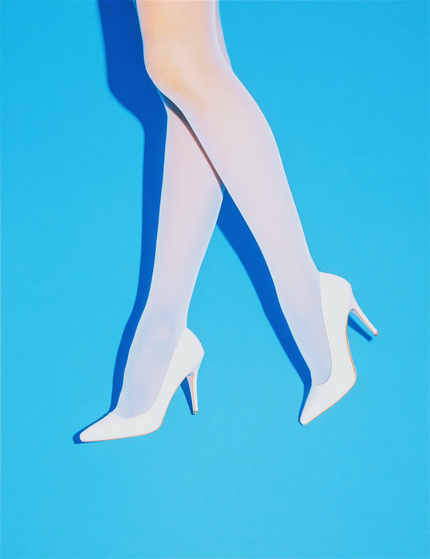 Striking image of elegant legs in white tights and high heels against a vivid blue backdrop, showcasing clean and minimalistic fashion.