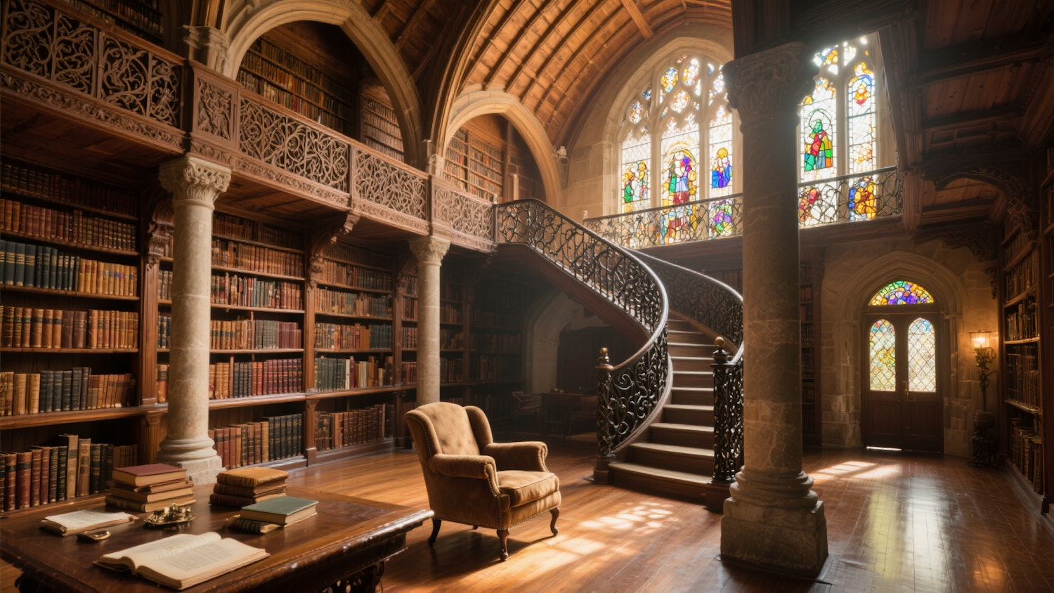 A labyrinthine library interior with vaulted wooden beams, floating spiral staircase, dappled sunlight filtering through stained glass, timeless architectural drama