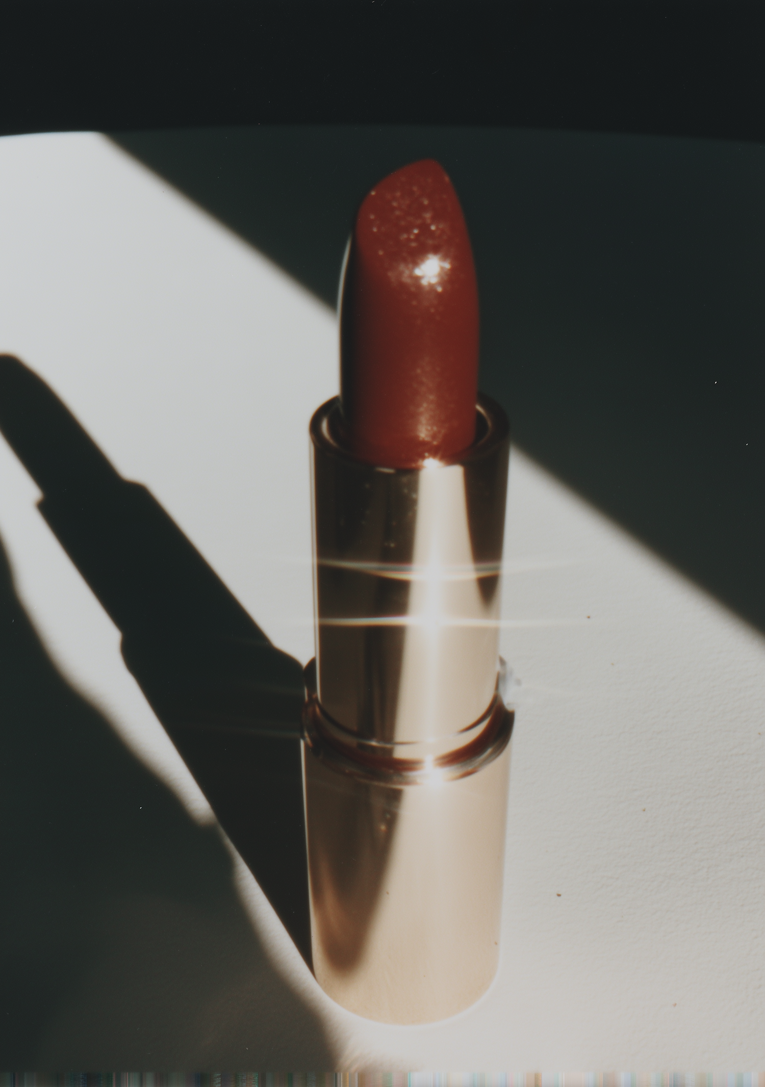 A close-up of a red lipstick in a golden tube, with dramatic lighting and shadows on a white surface.