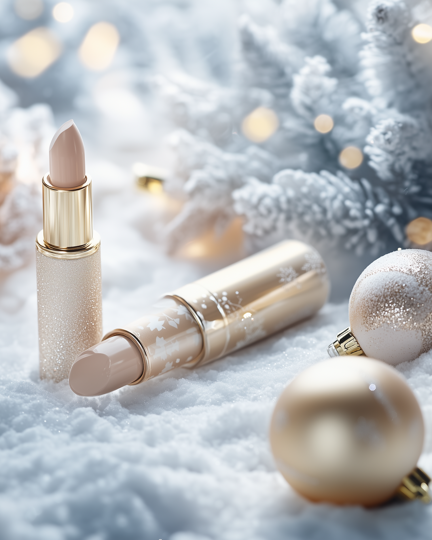Elegant gold lipsticks on snow with festive ornaments and frosted pine branches, creating a luxurious winter holiday vibe.