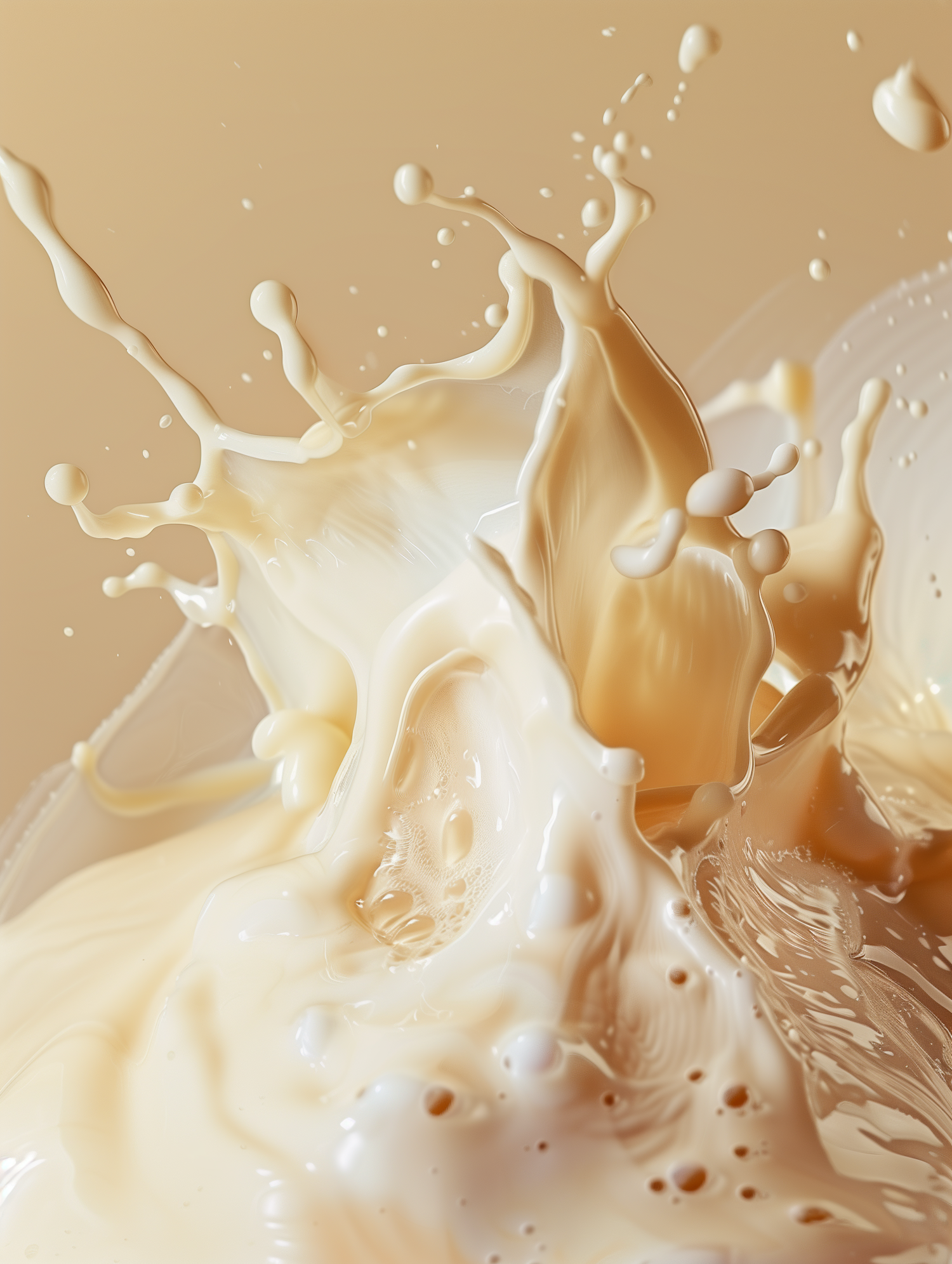 A close-up of a beige liquid splash in mid-motion, with detailed textures and reflections against a complementary background.