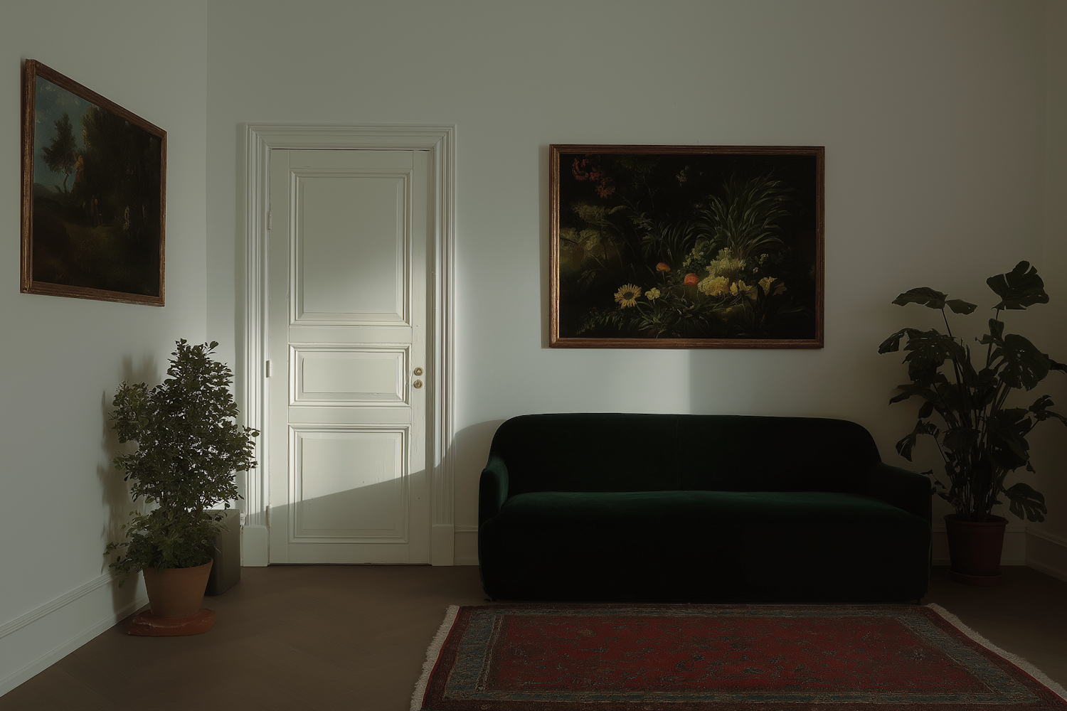 Minimalist living room with a green velvet sofa, framed art, potted plants, and a red rug, bathed in soft natural light.