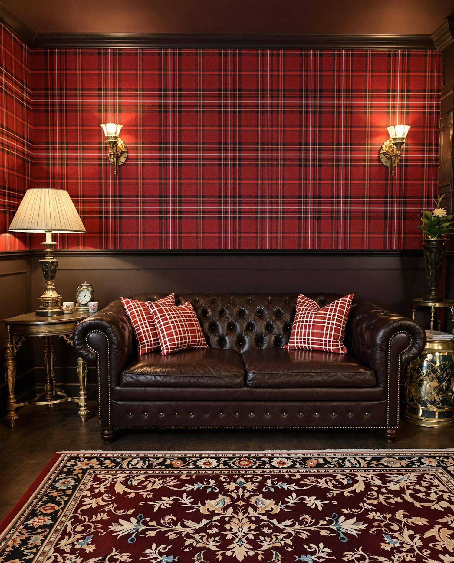 Elegant living room with a leather Chesterfield sofa, red tartan wallpaper, plaid pillows, and a floral rug for a cozy, traditional vibe.