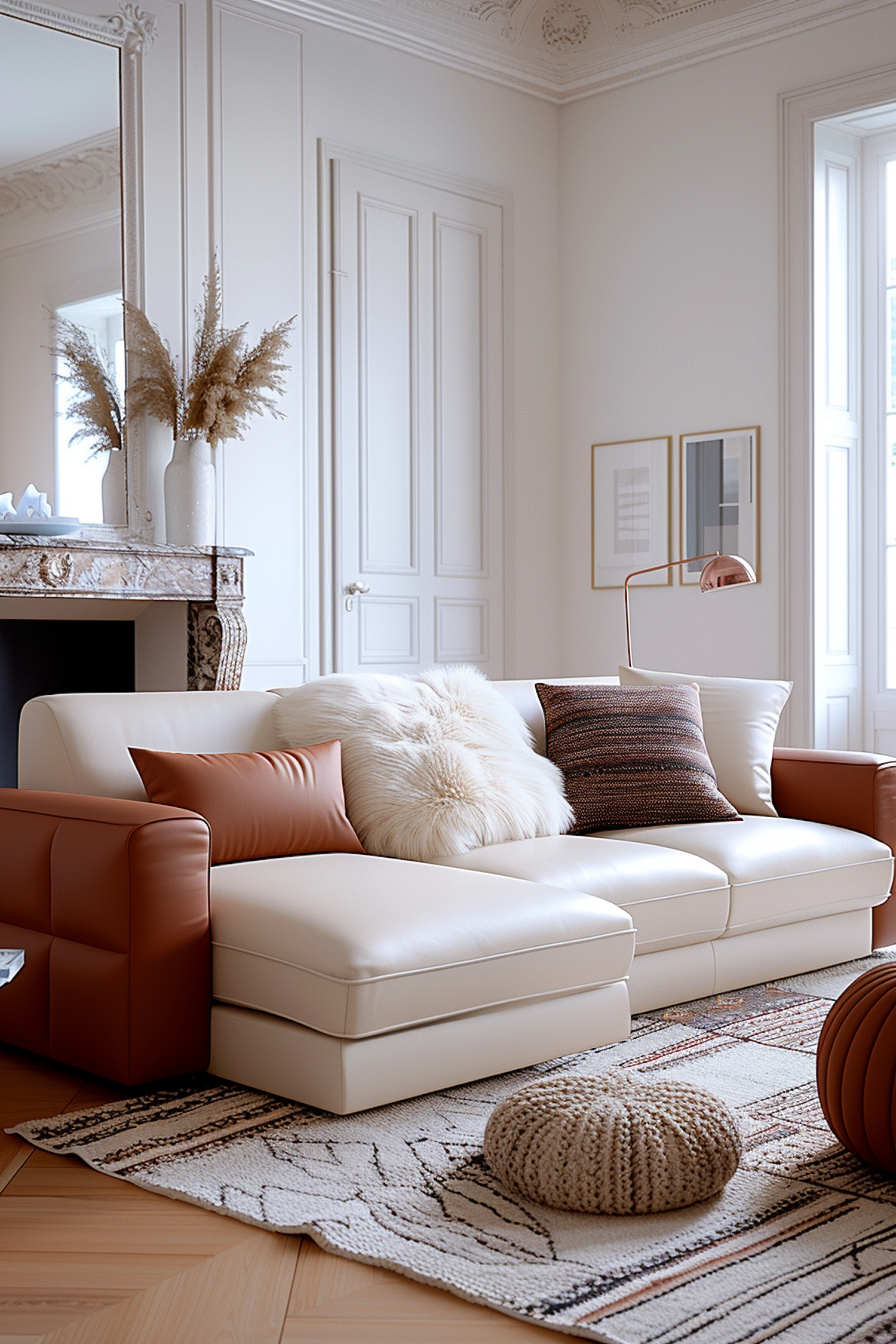 Elegant living room with cream sofa, caramel accents, pampas grass decor, and cozy textures in a bright, minimalist setting.