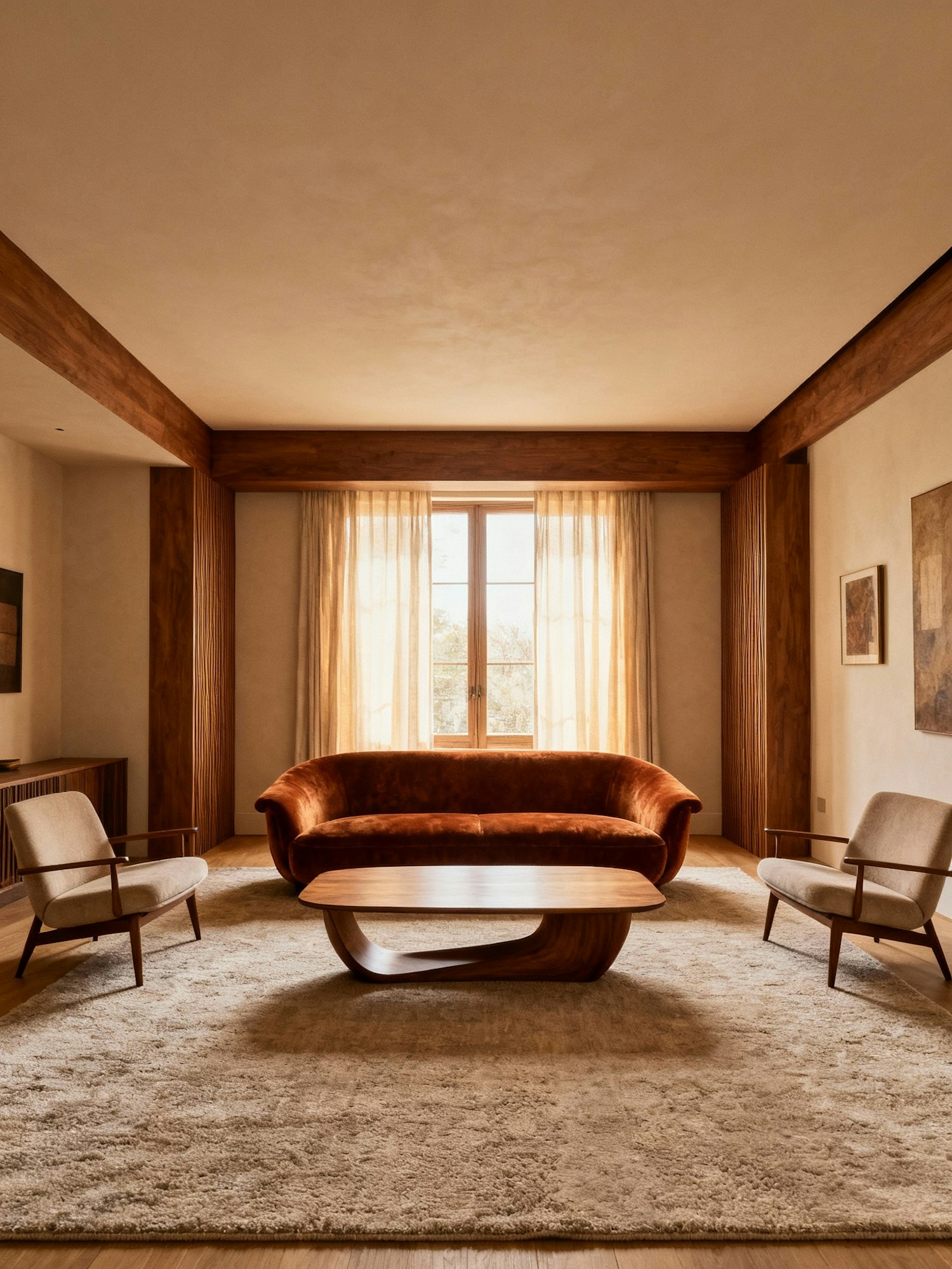 Professional interior design photography, warm and textured atmosphere, soft natural lighting, retro-modern aesthetic, mid-century inspired furniture, crafted wooden details, neutral tones with accents of earthy colors, editorial style, timeless and sophisticated mood. A frontal shot of a living room with a retro velvet sofa and sculptural coffee table. The furniture is centered in the frame, photographed straight-on with a balanced, symmetrical composition. Minimal artwork on the wall and large windows in the background create a clean, modern-retro aesthetic.