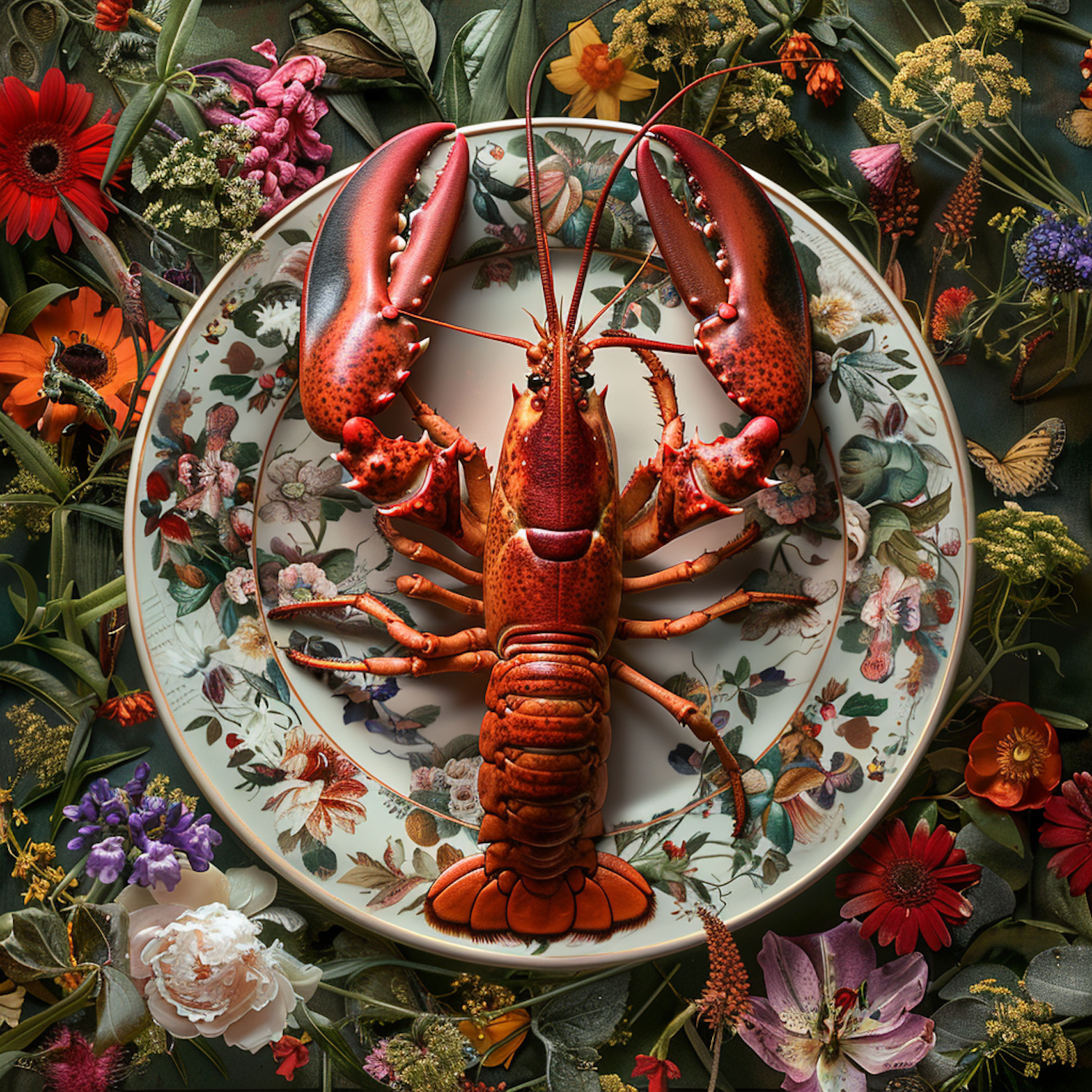 A vibrant lobster on a floral plate surrounded by colorful flowers, blending culinary art with nature's beauty.