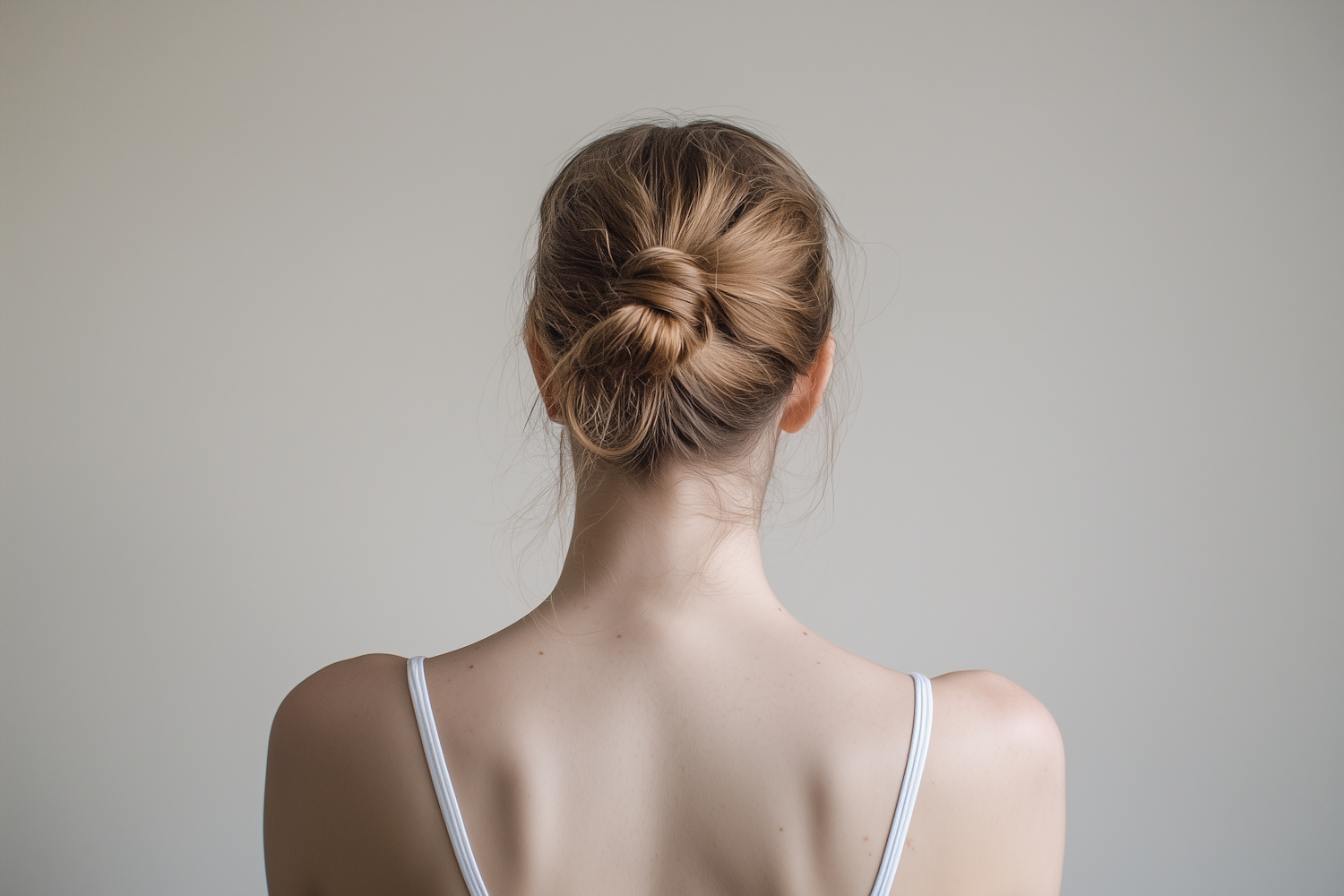 Minimalist back view of a woman with a neat low bun hairstyle and white spaghetti strap top against a plain gray background.