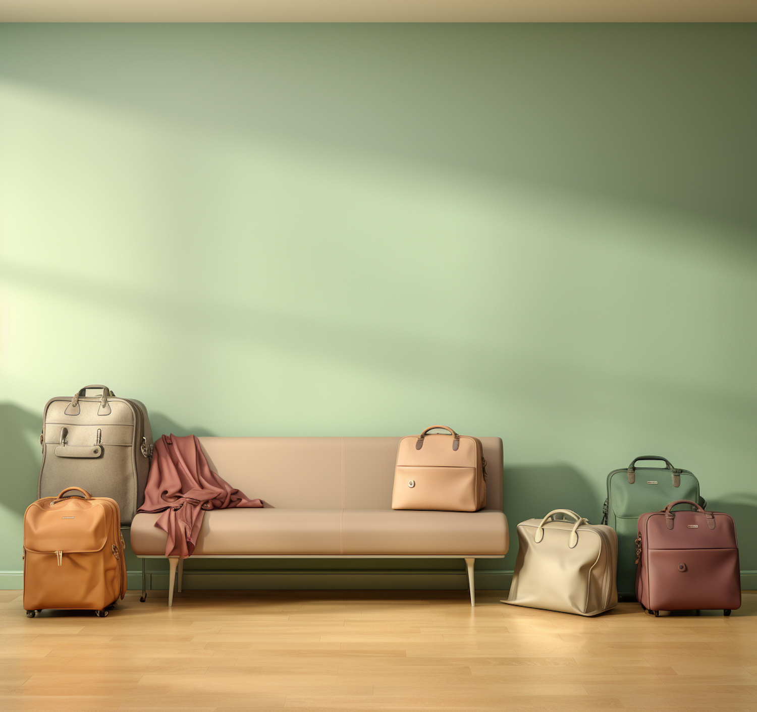 Elegant room with a beige sofa, stylish bags, and a soft green wall. Perfect blend of colors and minimalist design.