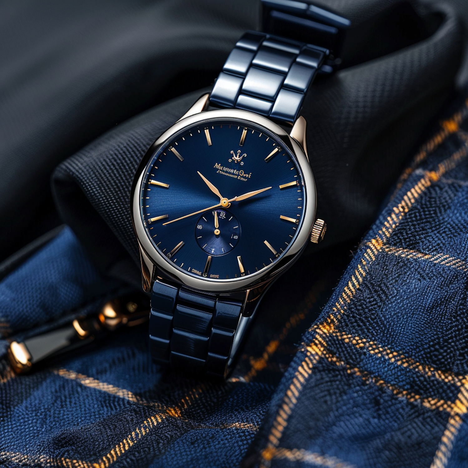 Elegant blue and gold wristwatch on black fabric with plaid accents, exuding luxury and sophistication.