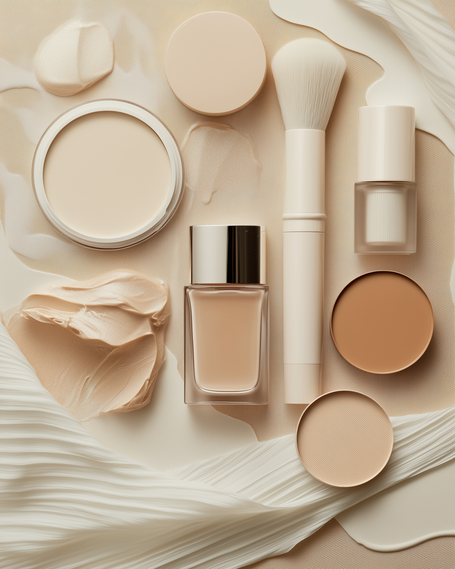 Elegant flat lay of neutral-toned makeup products on a textured beige surface, featuring foundation, powder, and a brush.