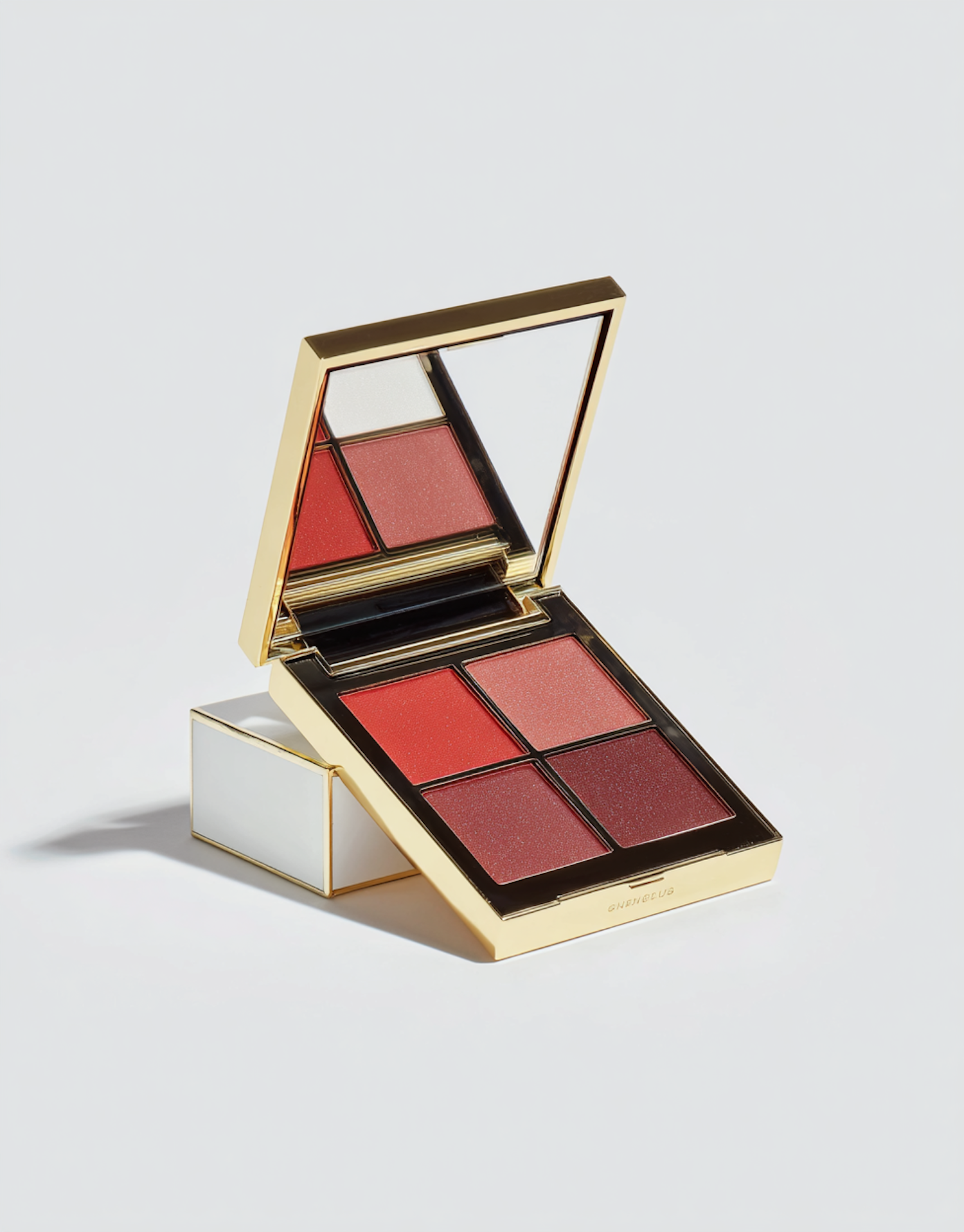 Elegant gold makeup palette with four vibrant red and pink shades, perfect for a sophisticated and portable beauty solution.
