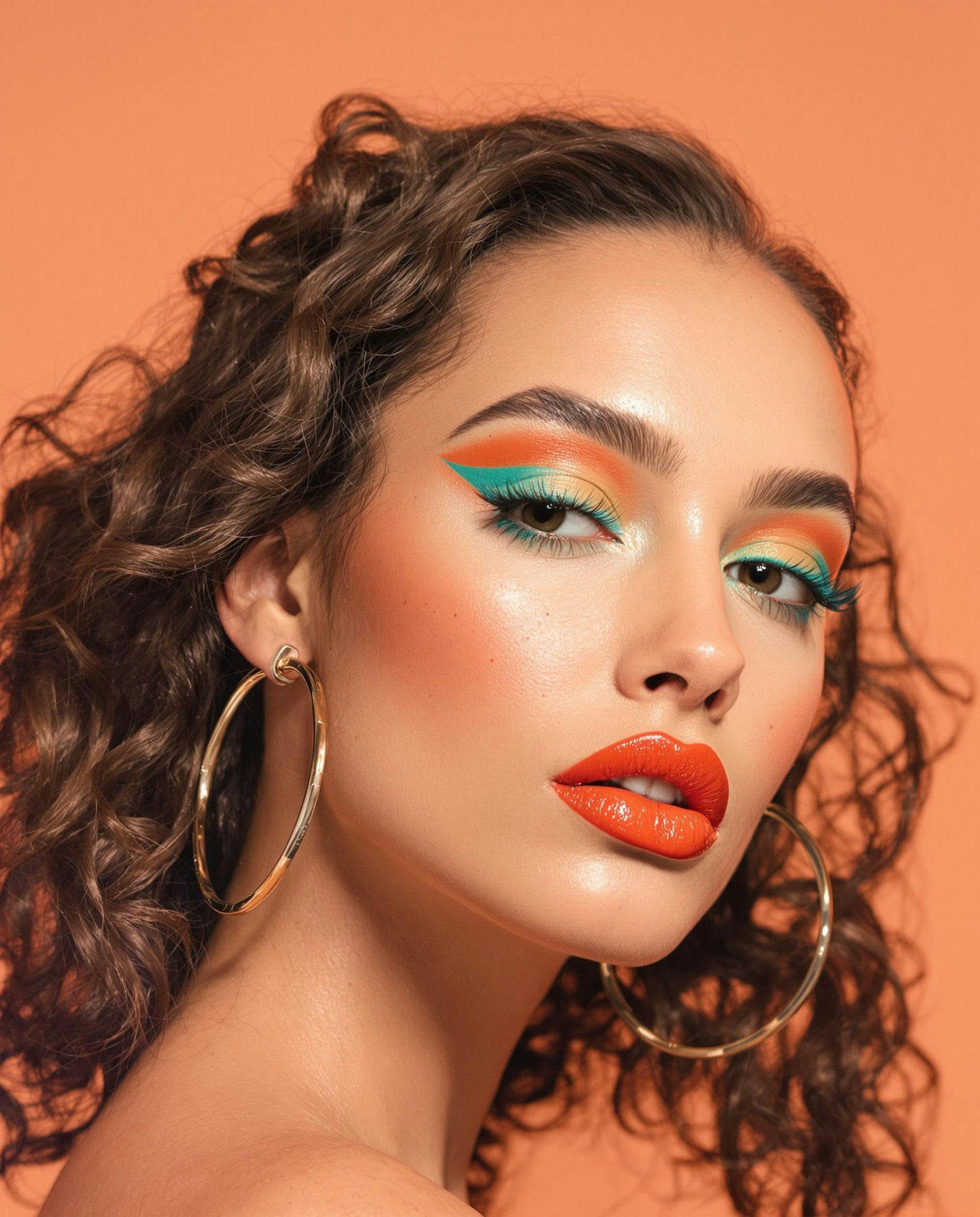 Beauty portrait of a young woman with glossy turquoise eyeshadow and orange glossy lips, luminous skin with light freckles, soft curls, wearing large gold hoop earrings, smooth gradient peach background, studio lighting, fashion editorial style