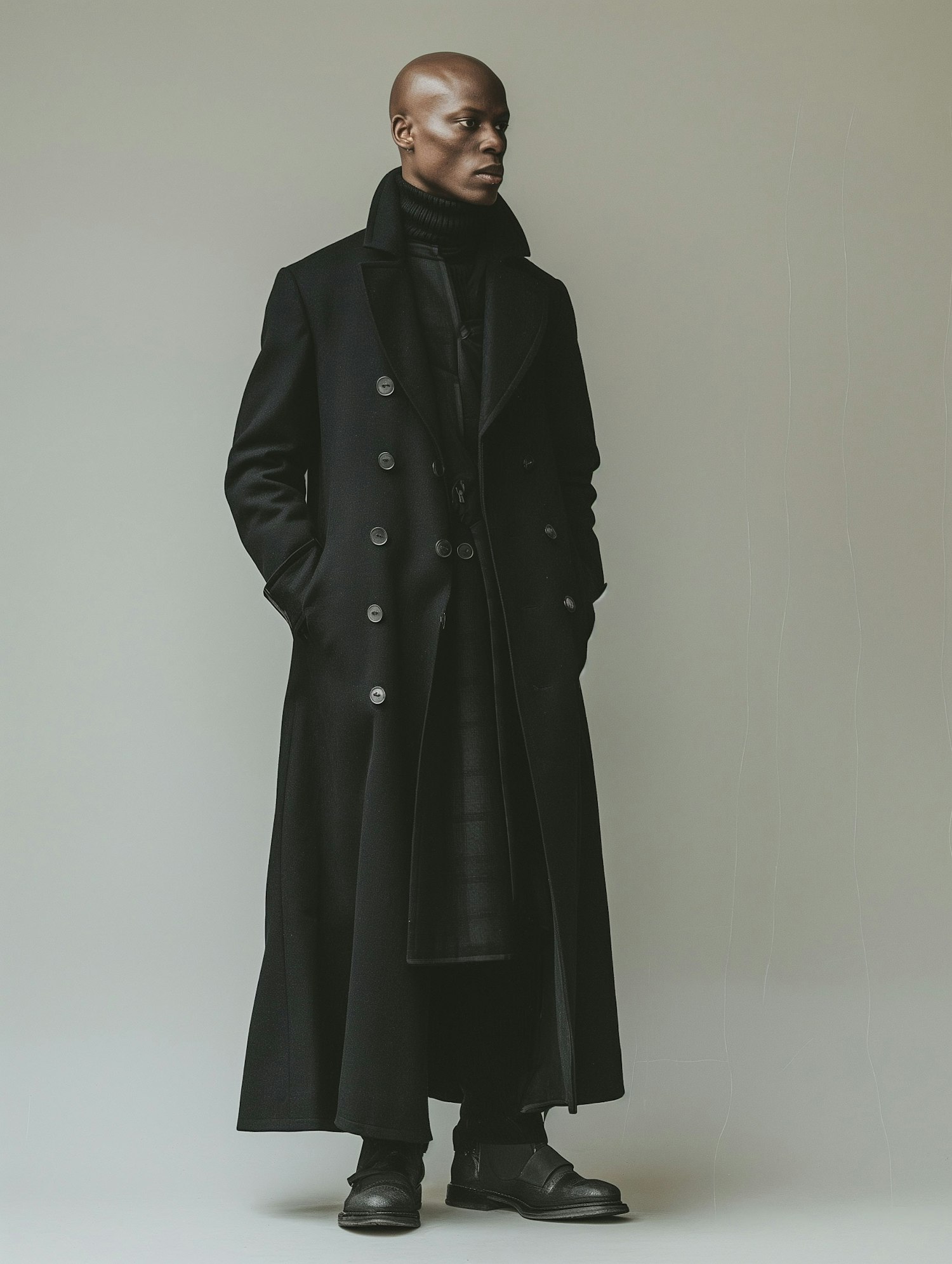 Stylish Black man in a long black coat and turtleneck, exuding elegance and sophistication against a plain backdrop.