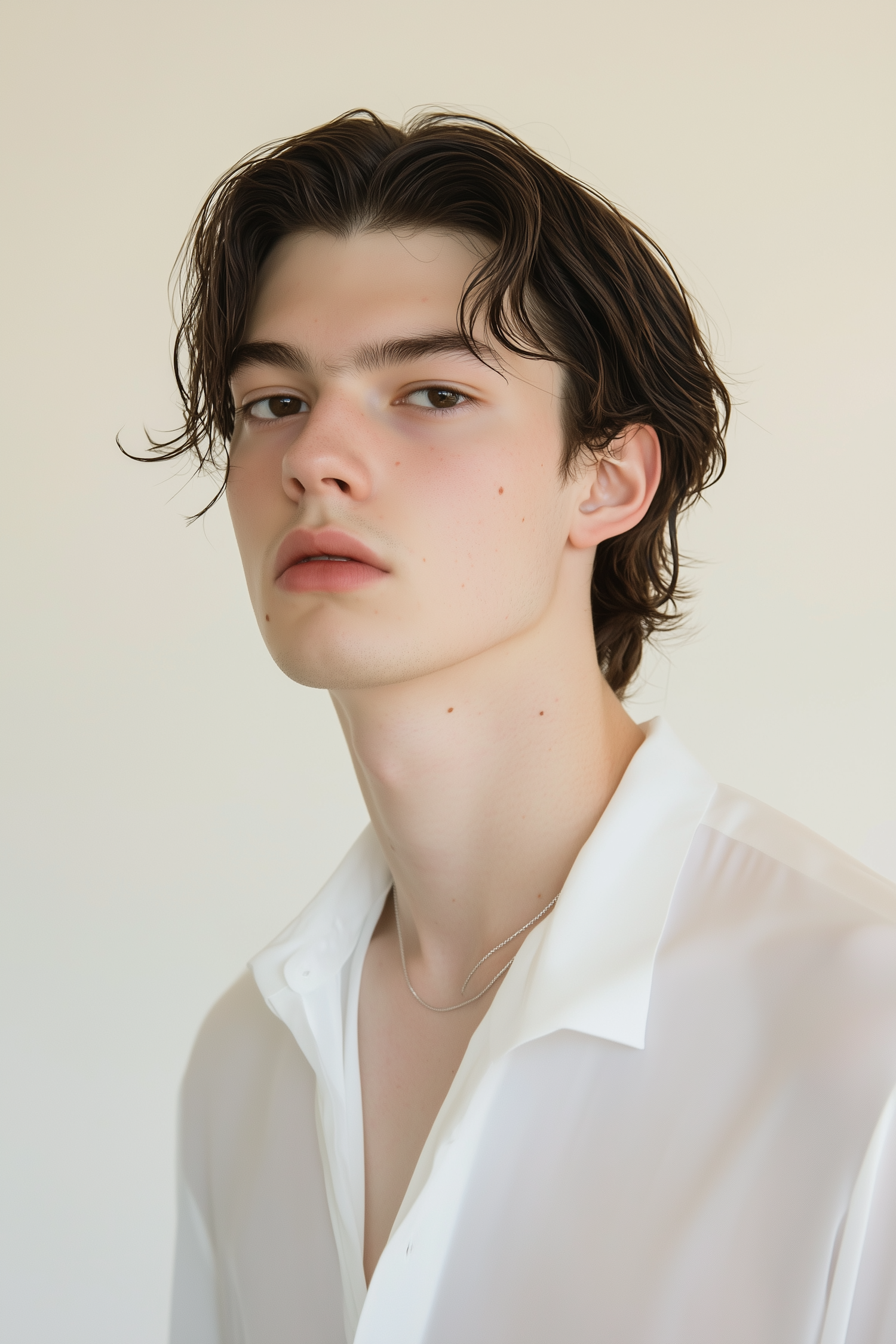 Young man with dark wavy hair, wearing a white shirt and silver necklace, posing against a beige background.