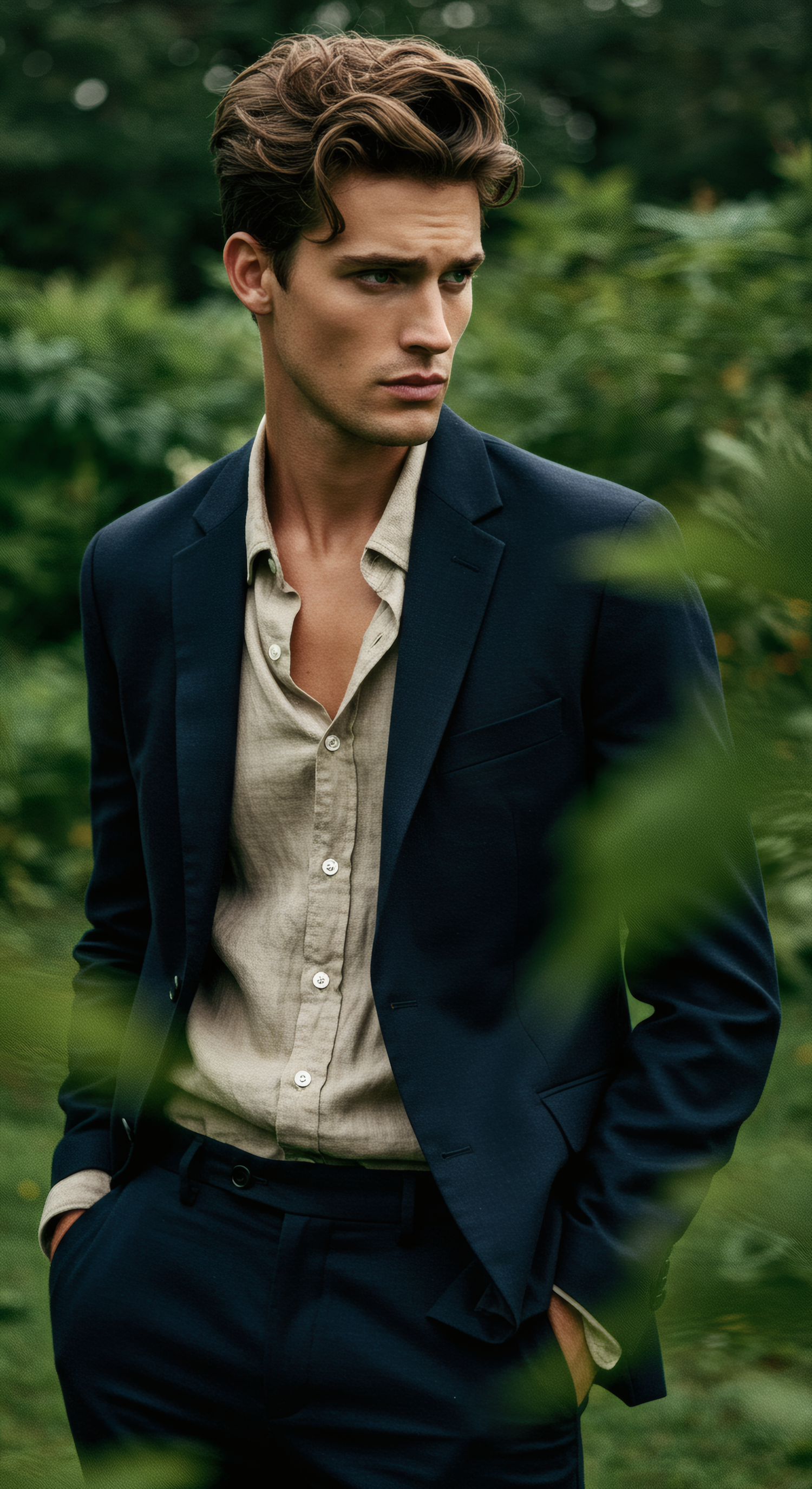 Stylish young man in a navy suit and beige shirt amidst lush greenery, exuding elegance and contemplation.