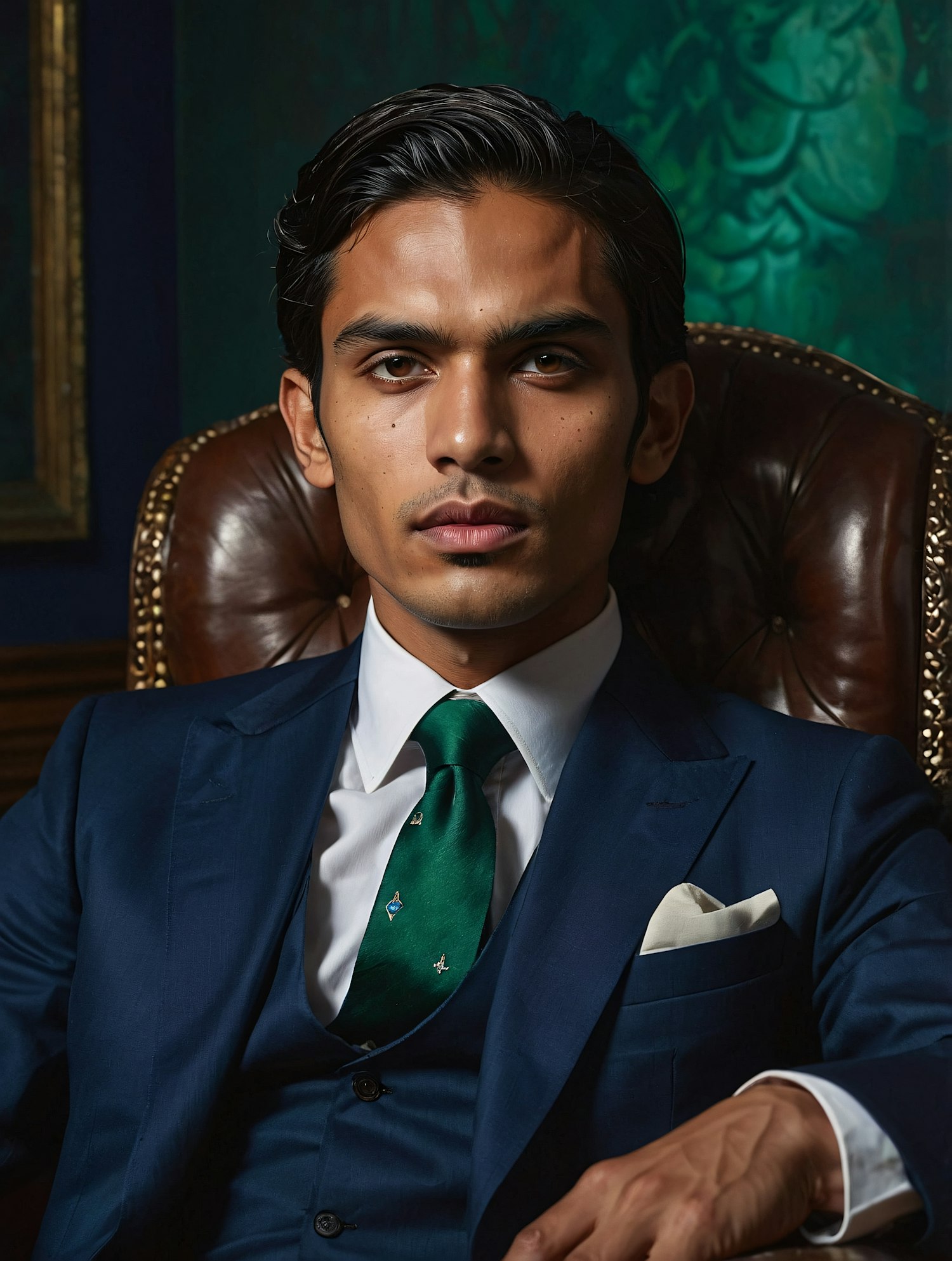 Confident man in a navy suit with a green tie, sitting in a leather chair against a dark green background.