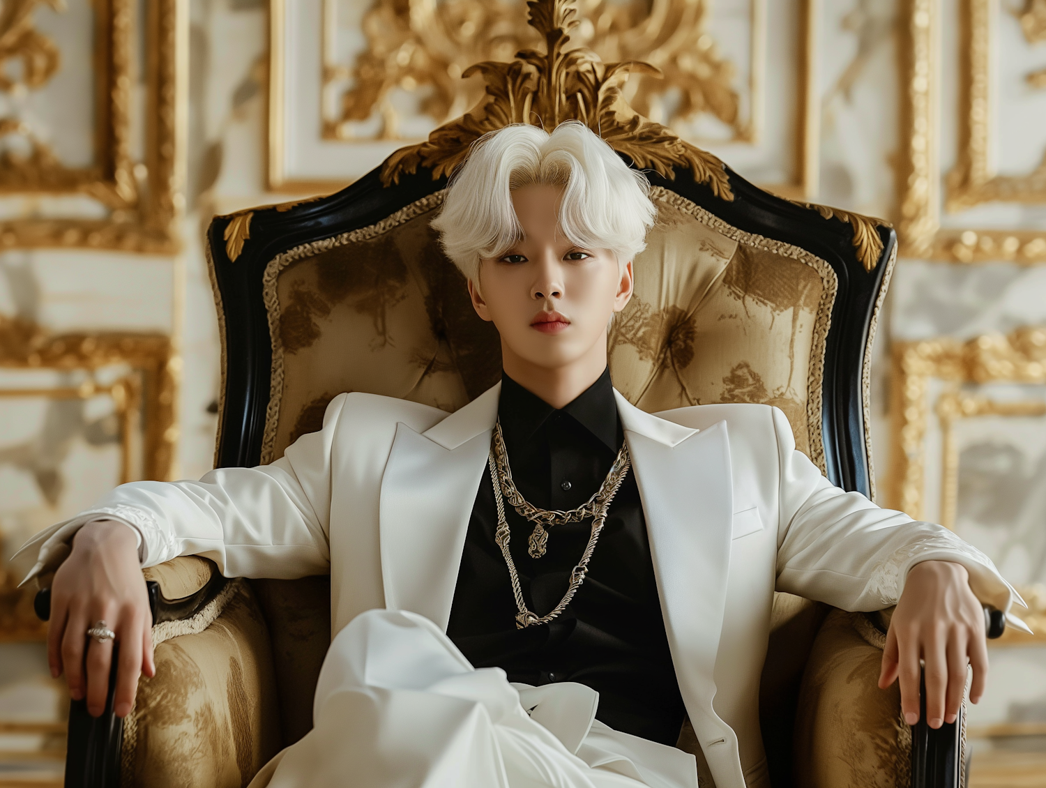 Elegant young man in a white suit sits on a luxurious armchair, exuding confidence and style in a lavish setting.