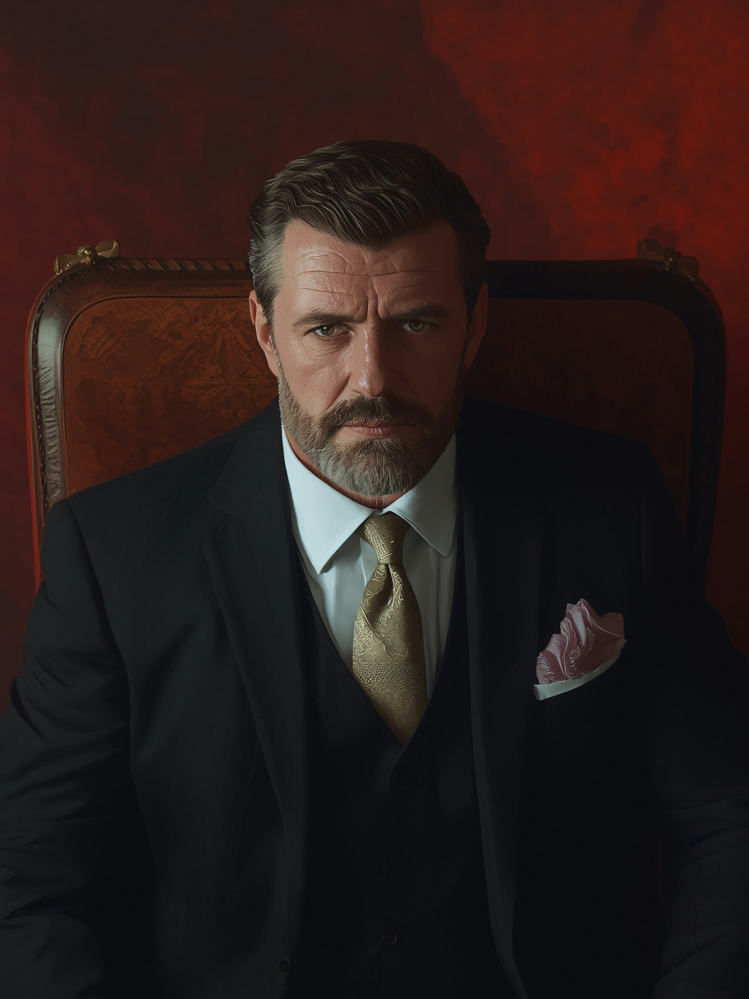A man in a black suit with a gold tie and pink pocket square sits against a red background, exuding a formal and composed demeanor.