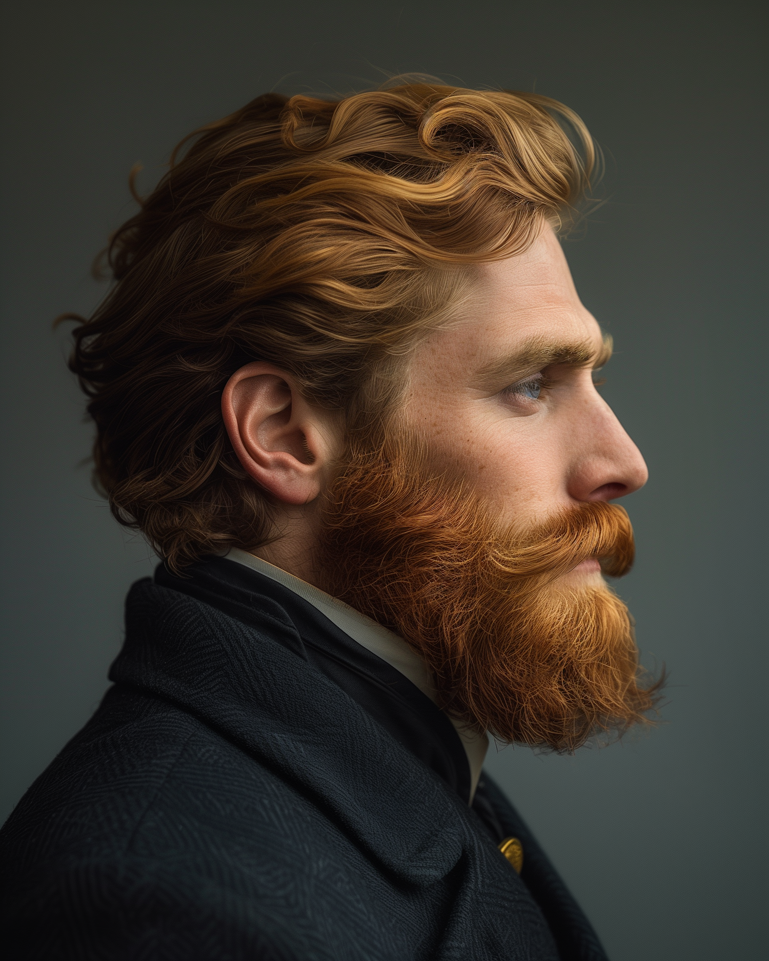 Profile of a man with a red beard and wavy hair, wearing a dark coat. His contemplative expression adds depth to the portrait.