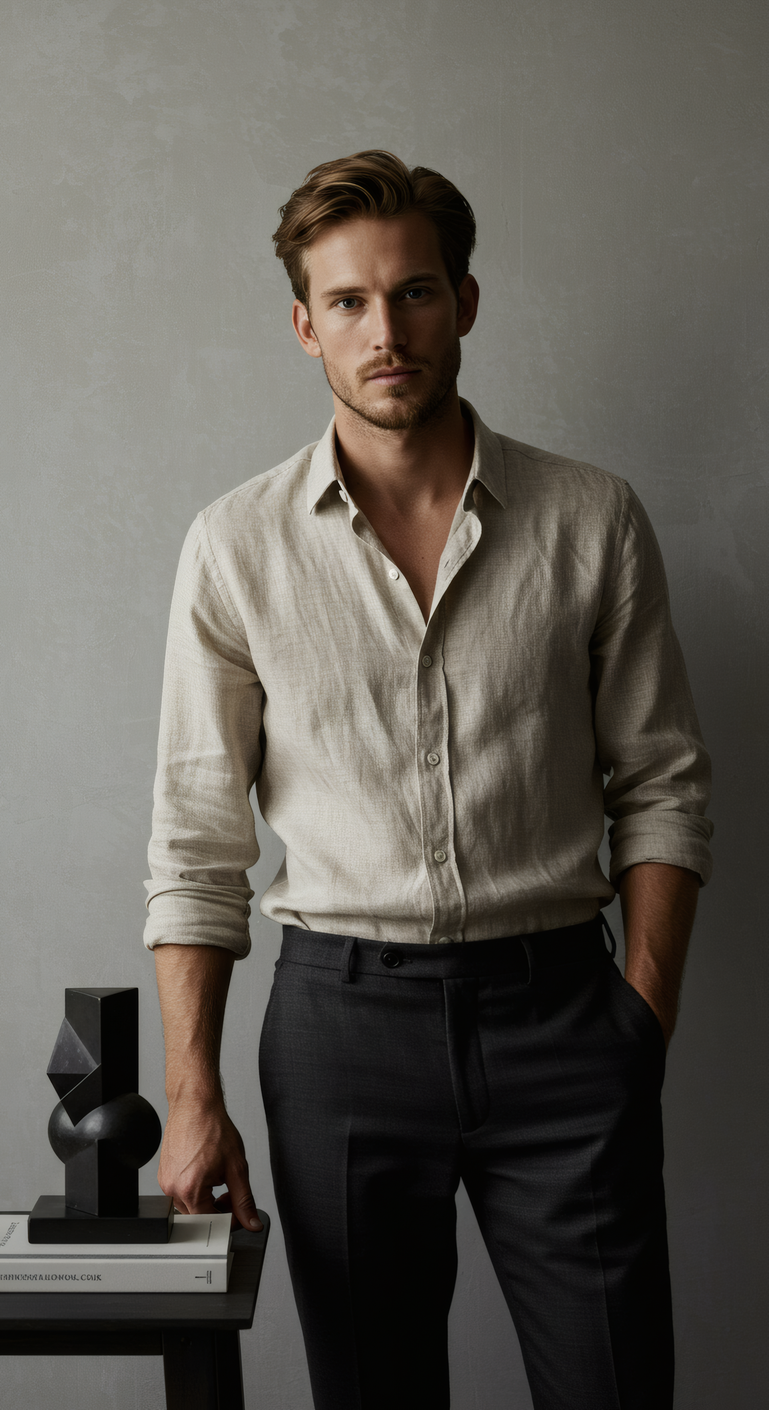 Stylish man in beige shirt and dark trousers with modern sculpture on table, set against a minimalist gray background.