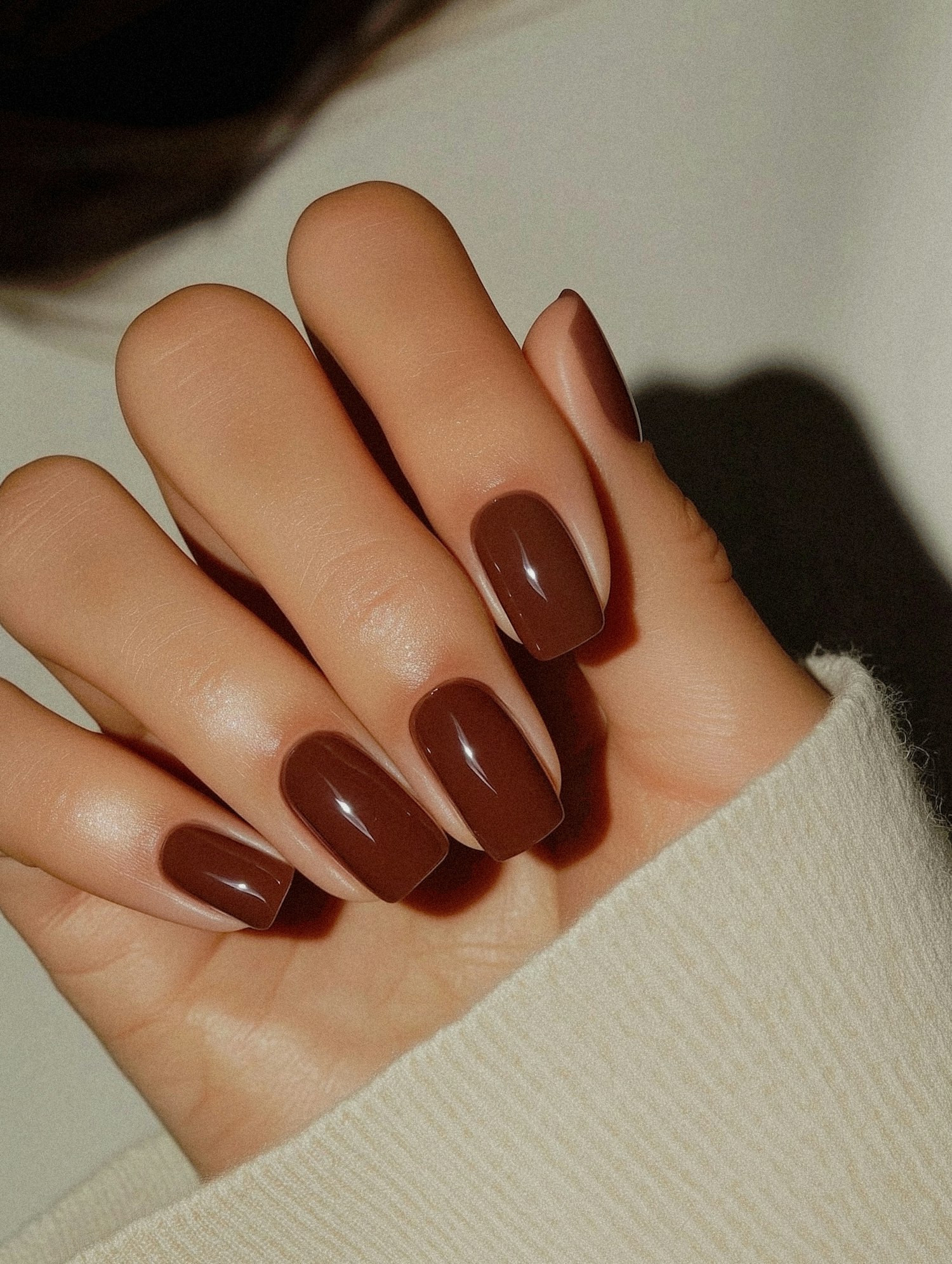 Close-up of a hand with glossy brown square-shaped nails against a cream sweater backdrop.