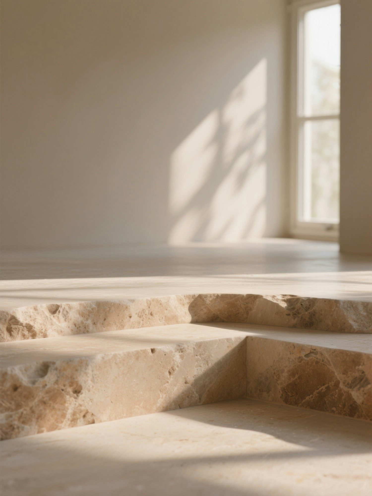 Elegant beige marble steps in a sunlit minimalist interior, showcasing natural textures and warm lighting for a serene ambiance.