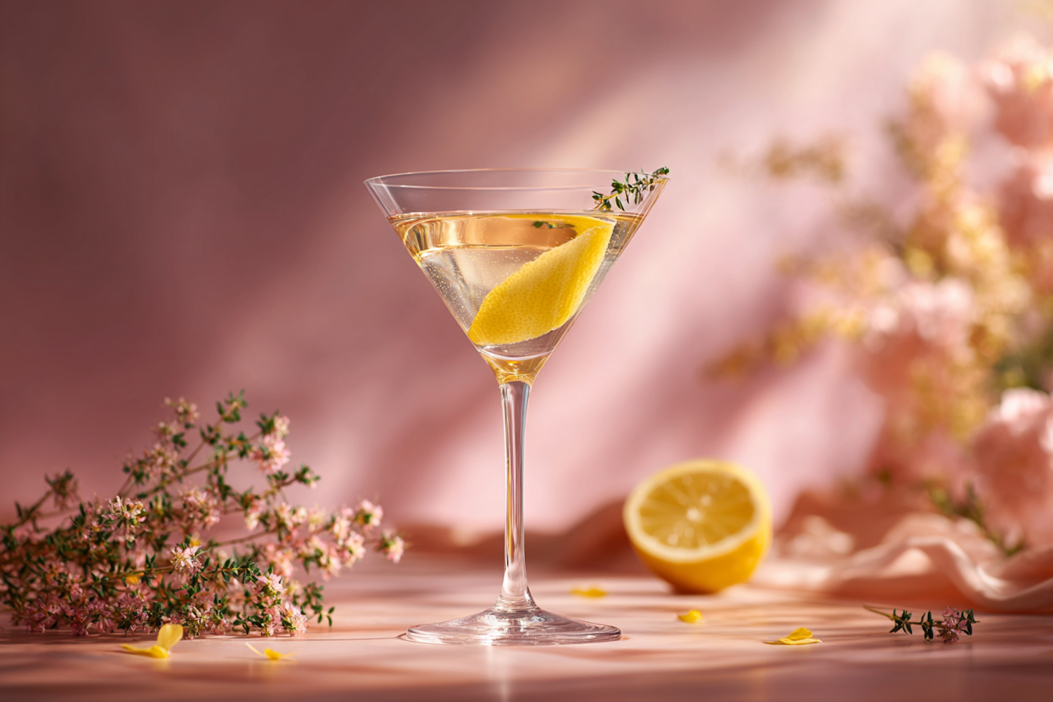 Elegant martini glass with a lemon twist and thyme garnish, set against a soft pink floral background. Perfect for cocktail inspiration.